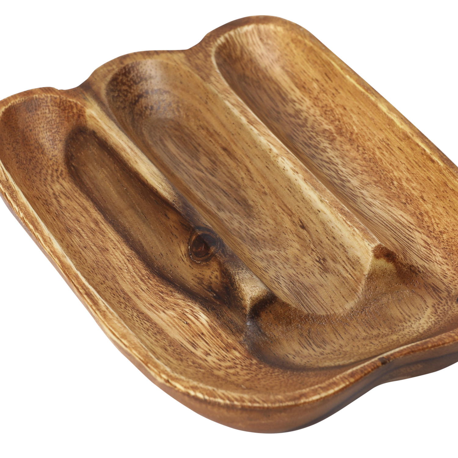 This strikingly modern acacia wood tray showcases 3 intricately carved sections.