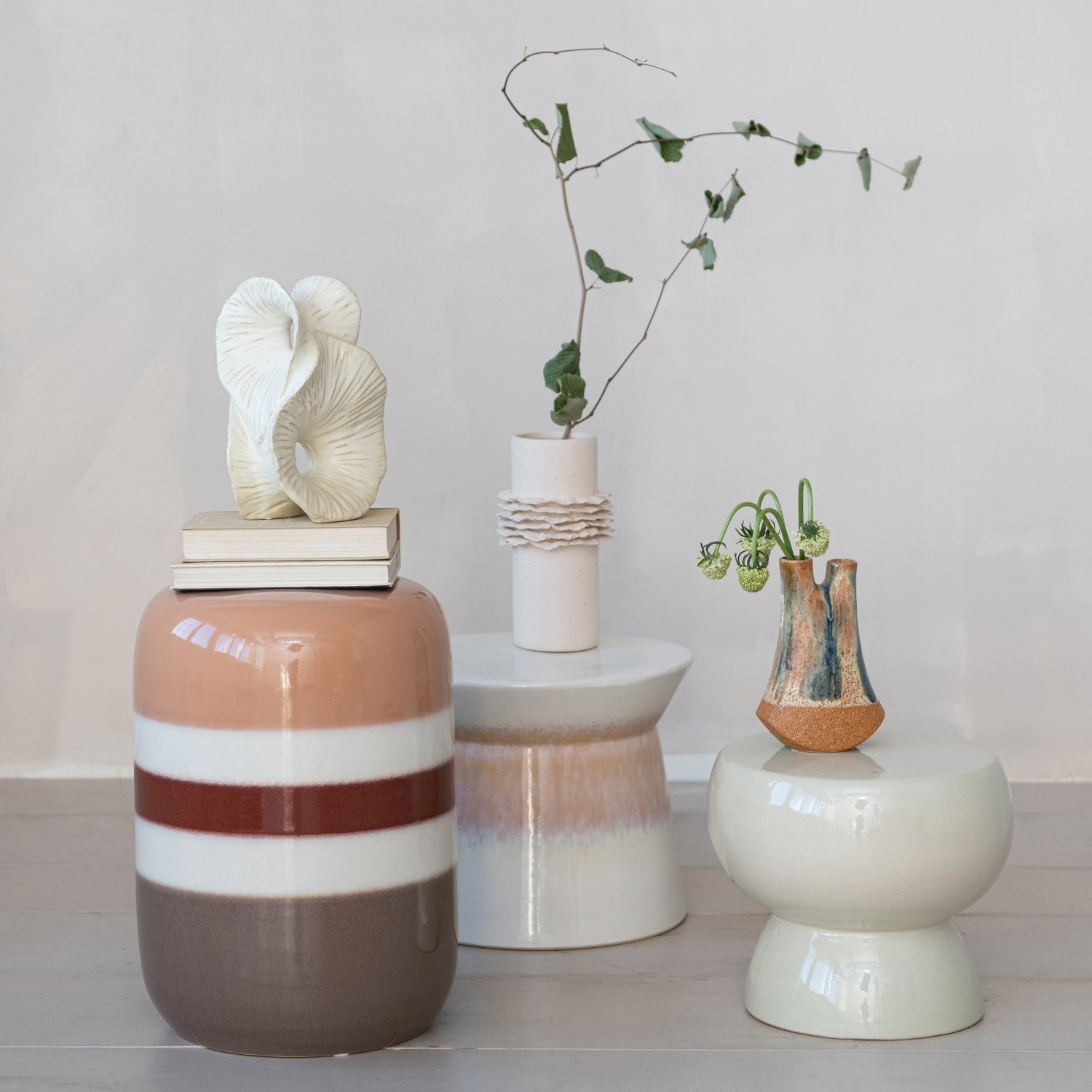 This Stoneware Stool Table, a conversation starter in any room, boasts a mesmerizing reactive glaze that dances with stripes of white, cream, grey, and terra cotta. Each piece is unique, receive a truly one-of-a-kind work of art. Measuring 13.25 inches in diameter and 18.25 inches in height, its versatility allows it to seamlessly transition between a side table displaying varied décor to a comfortable stool for an extra guest. Crafted from high-quality, durable stoneware, this piece arrives fully assembled for immediate enjoyment and is shipped securely via truck for peace of mind. Complete the space with a touch of artistry and function.