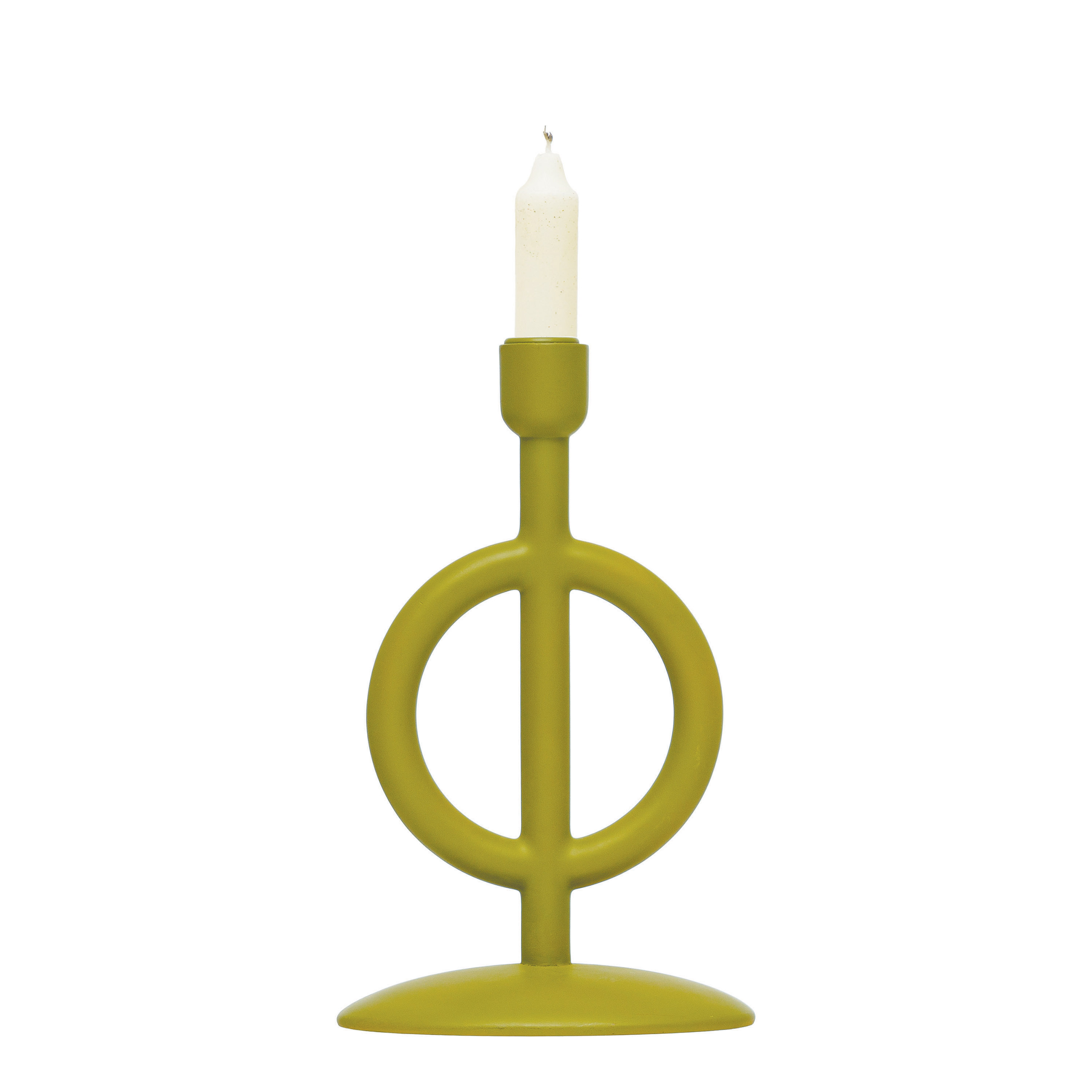 This rustically modern taper candle holder showcases a stunning ringed sculptural base in a matte green finish. Resin taper candle holder in matte green finish. Create the ultimate tablescape with this thoughtfully crafted candleholder. Display this stylishly versatile candle holder as a sophisticated mantel accent or inviting dining table centerpiece.