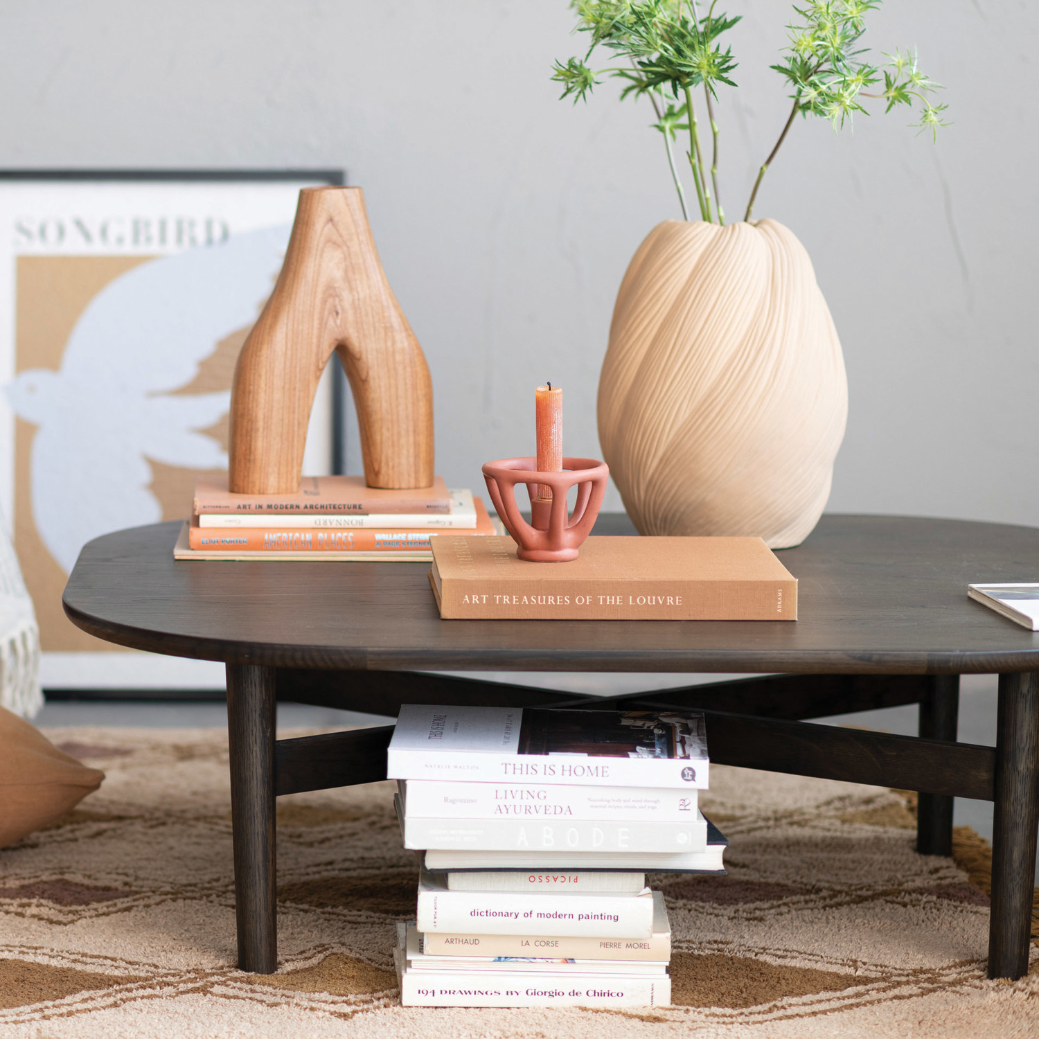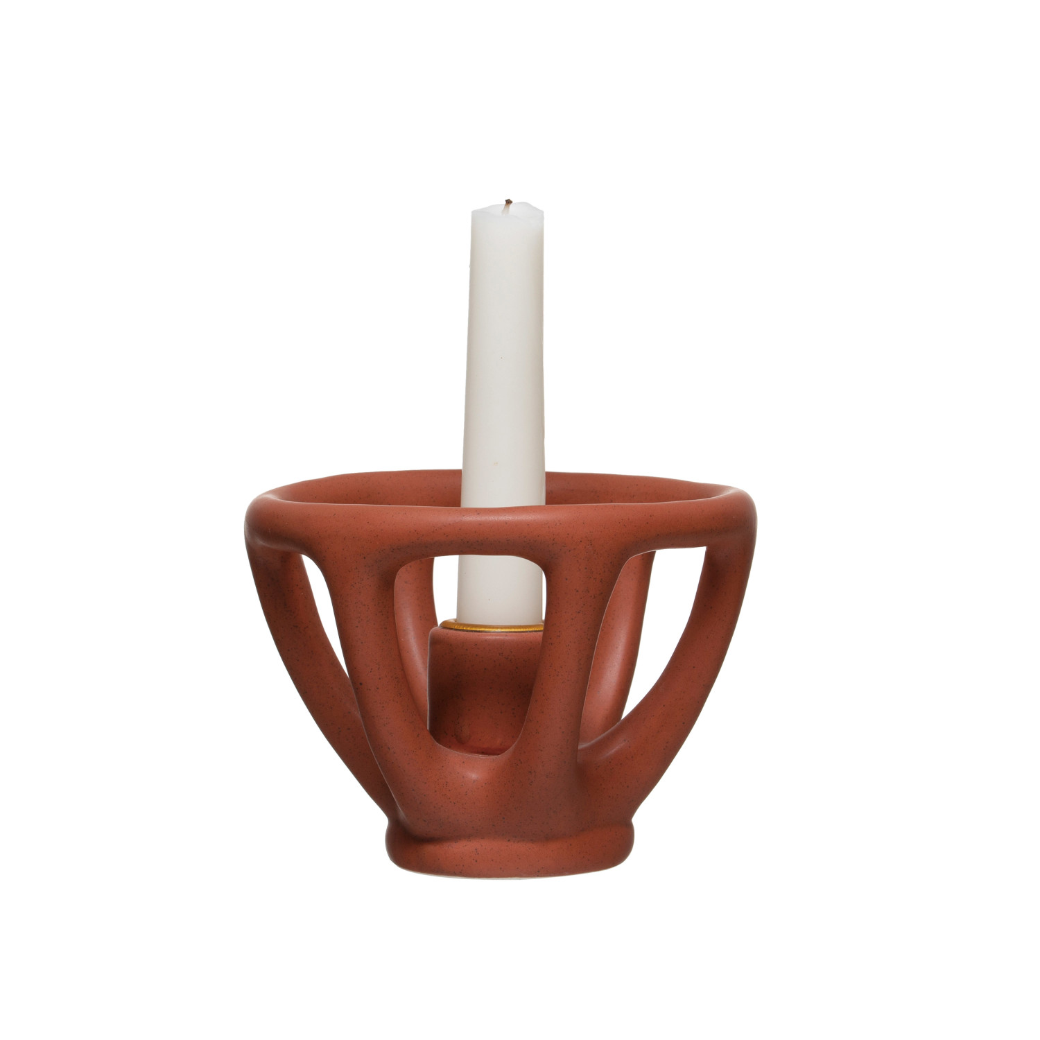 This boldly designed stoneware taper candle holder showcases an abstract basket silhouette in a stylish matte finish.