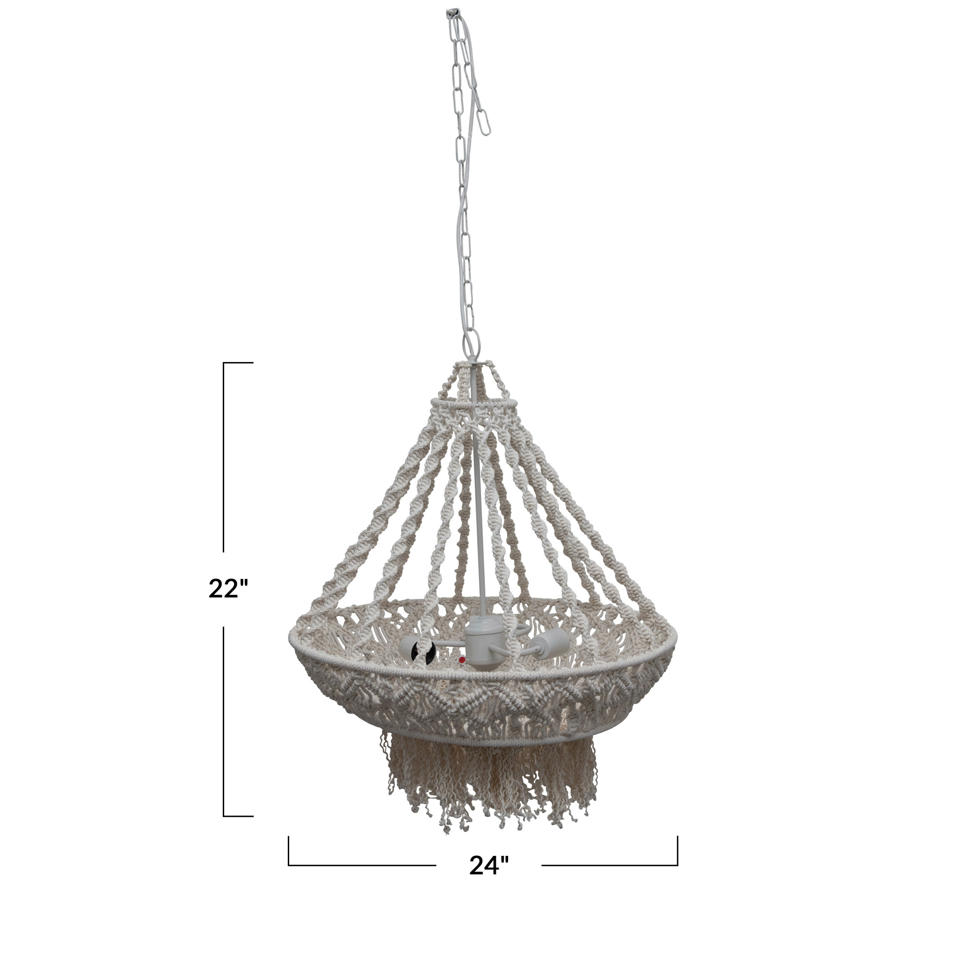 Catalog Name: 24" Round x 22"H Hand-Woven Cotton macrame & Metal Pendant Lamp w/ 3 Lights & Fringe, Natural, 6' Cord (40 Watt Bulb Maximum, Hardwire Only)