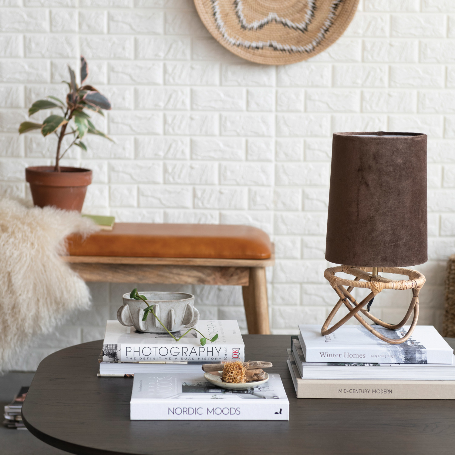 Hand-Woven Rattan Table Lamp w/ Cotton Velvet Shade & Inline Switch