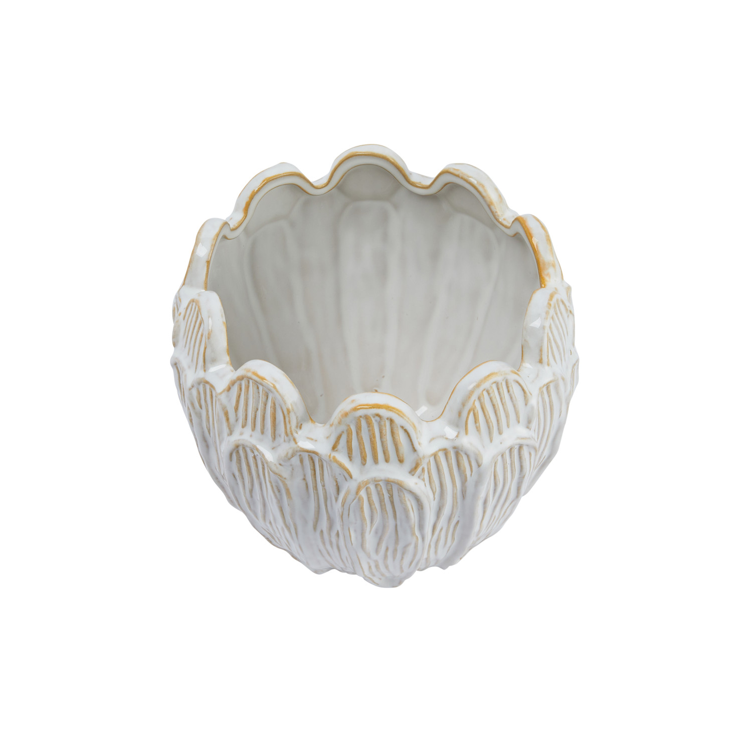 This Debossed Stoneware Flower Shaped Planter with Reactive Glaze in Cream Color creates a cozy and inviting space. This planter is made of high-quality, durable stoneware material with a flower-shaped silhouette and debossed pattern that gives it a rustic and elegant look. The planter has a reactive glaze finish that creates a natural variation of cream color, making each piece unique and beautiful. The planter has no drainage holes, so it is suitable for plants that do not require much water, such as succulents, cacti, or air plants. The planter measures 8.25 inches in diameter and 7.25 inches in height and can hold a large pot. This planter adds French country charm to the space with its lovely design, whether placed on the floor, table, windowsill, or shelf. A lovely stoneware planter that features a flower-shaped silhouette and a debossed pattern. Ideal for adding some French country charm to the indoor or outdoor plants. Durable and easy-to-clean planter with no drainage holes, can be wiped clean with a dry cloth. Made of stoneware.