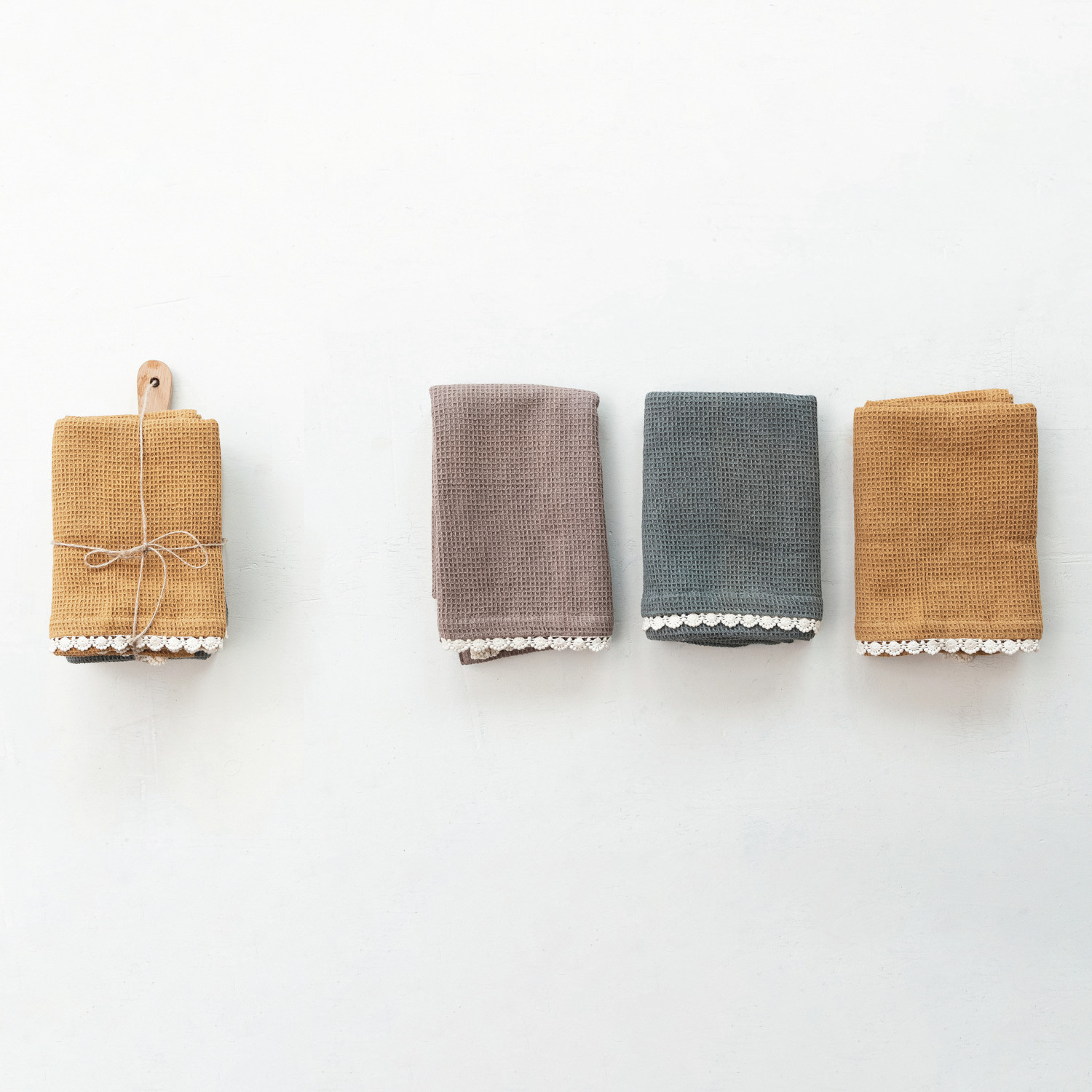Catalog Name: 28"L x 18"W (3) Cotton Waffle Weave Tea Towels w/ Crocheted Trim & 10"L x 5"W Mango Wood Cheese/Cutting Board w/ Handle, Multi Color & Natural, Set of 4