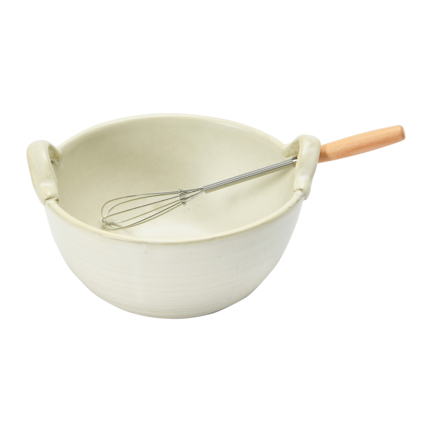 This batter bowl set is perfect for anyone that loves cooking and baking. Made out of stoneware, this bowl comes with a wooden handle whisk, and features a cream colored reactive glaze finish. This set is the perfect addition to any home, and adds extra style to any kitchen.