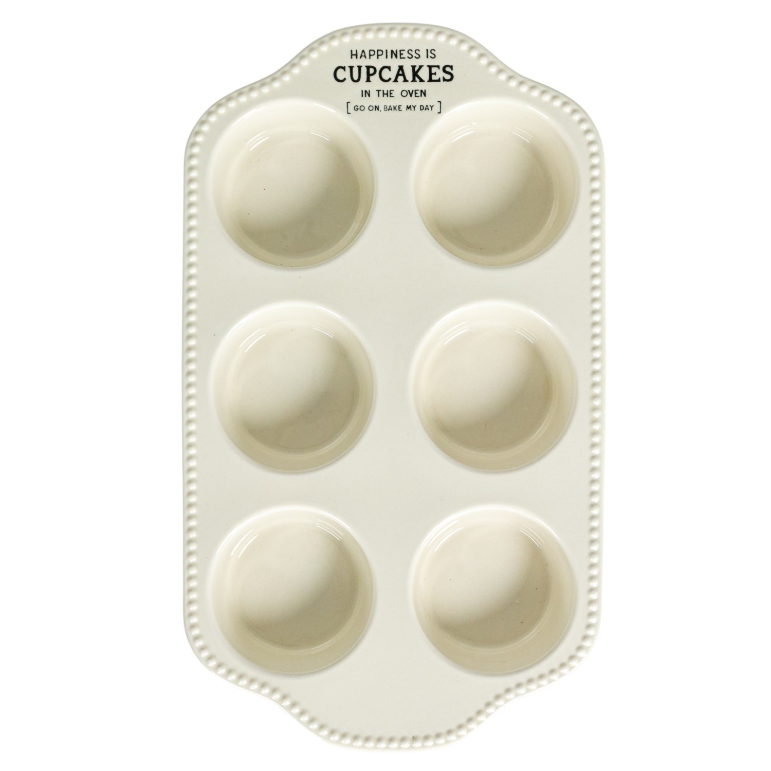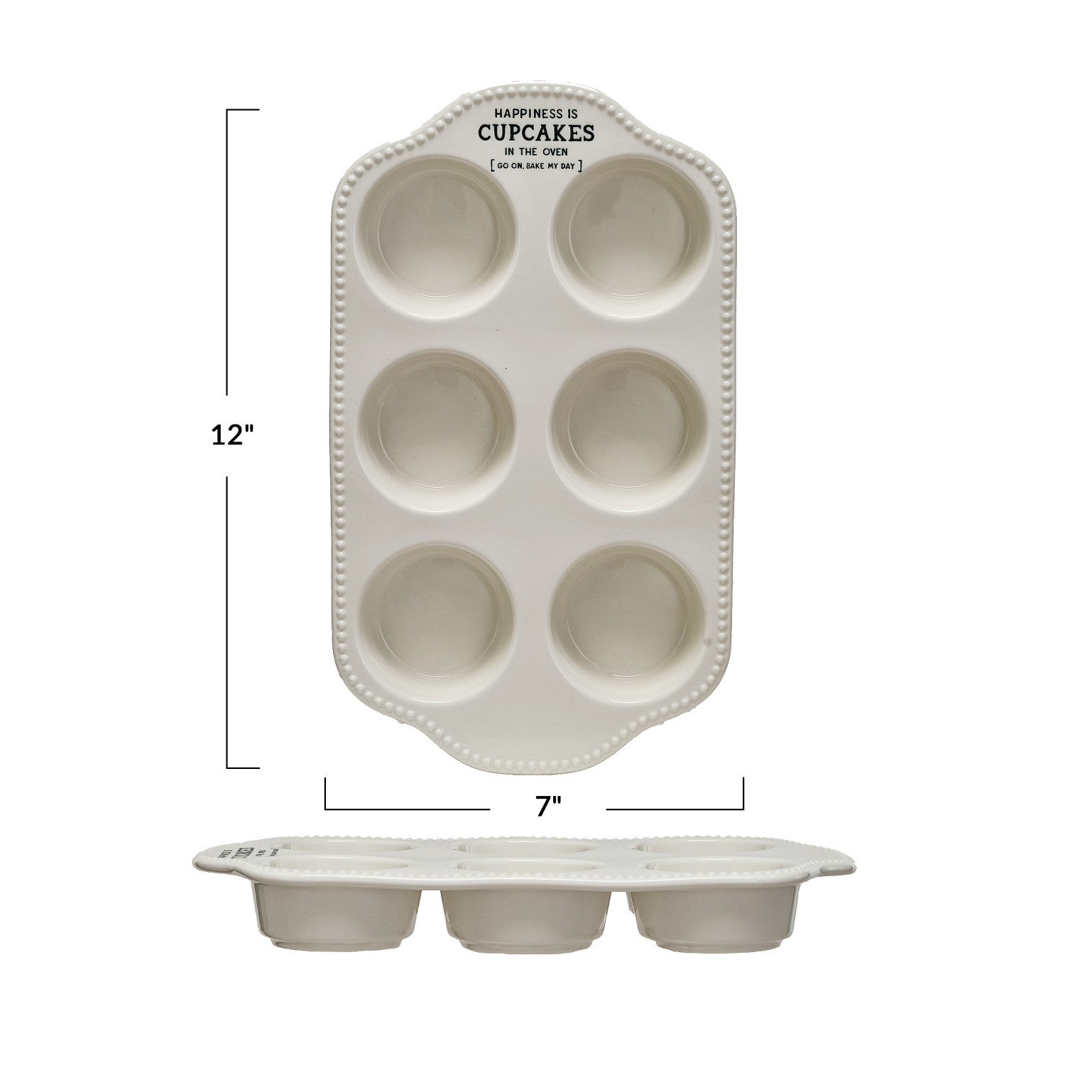 This 12-inch long, and 7-inch wide stoneware muffin pan is a baker's delight, complete with an uplifting message that reads "Happiness Is Cupcakes..." The rectangular pan, featuring six molds, is ideal for whipping up a batch of every favorite cupcake. Crafted from white stoneware, it not only bakes efficiently but also adds a touch of elegance to the kitchenware. Its charming design fits well within eclectic, farmhouse, or French country themes, inviting a warm, homemade feel to every culinary creation. Whether it's a weekend treat or a special occasion, this muffin pan is sure to spread happiness, one cupcake at a time.