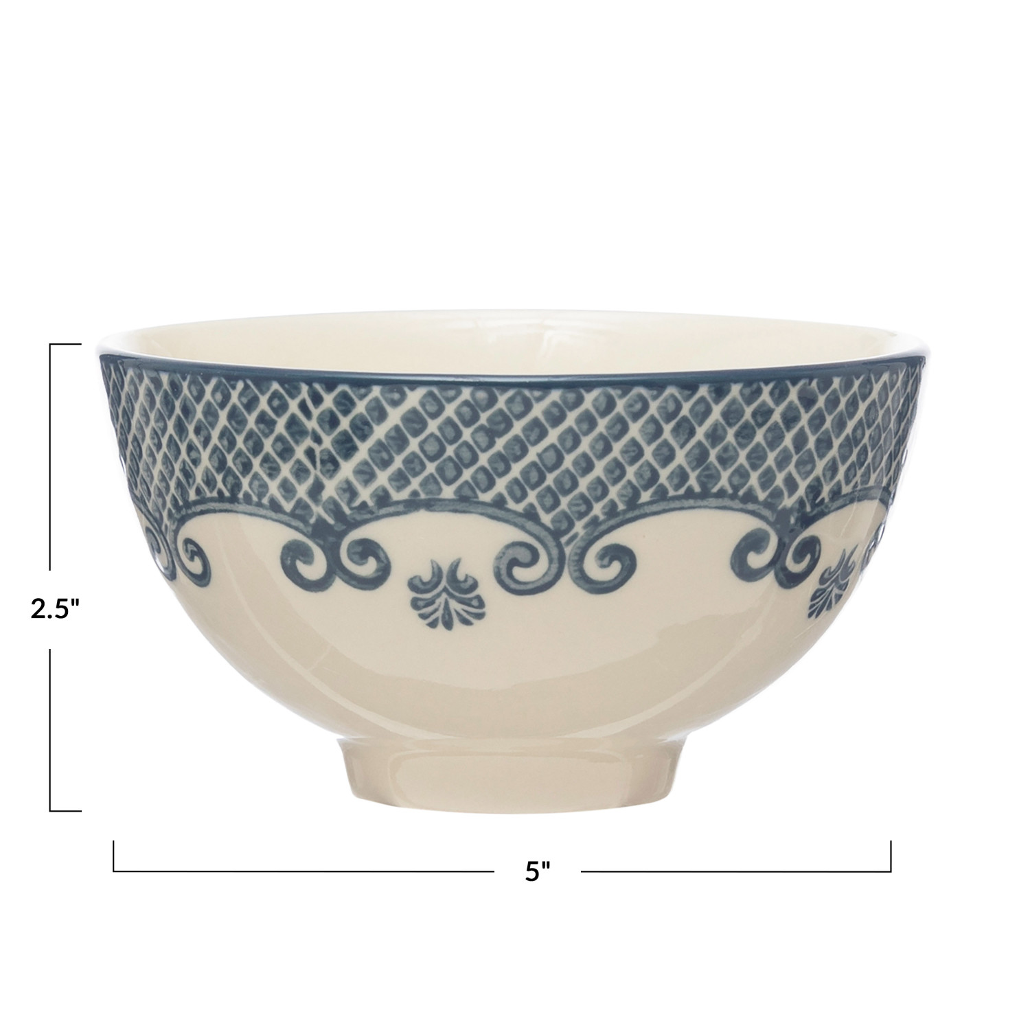Catalog Name: 5" Round x 2-1/2"H Hand-Stamped Stoneware Bowl w/ Pattern, Cream Color & Blue