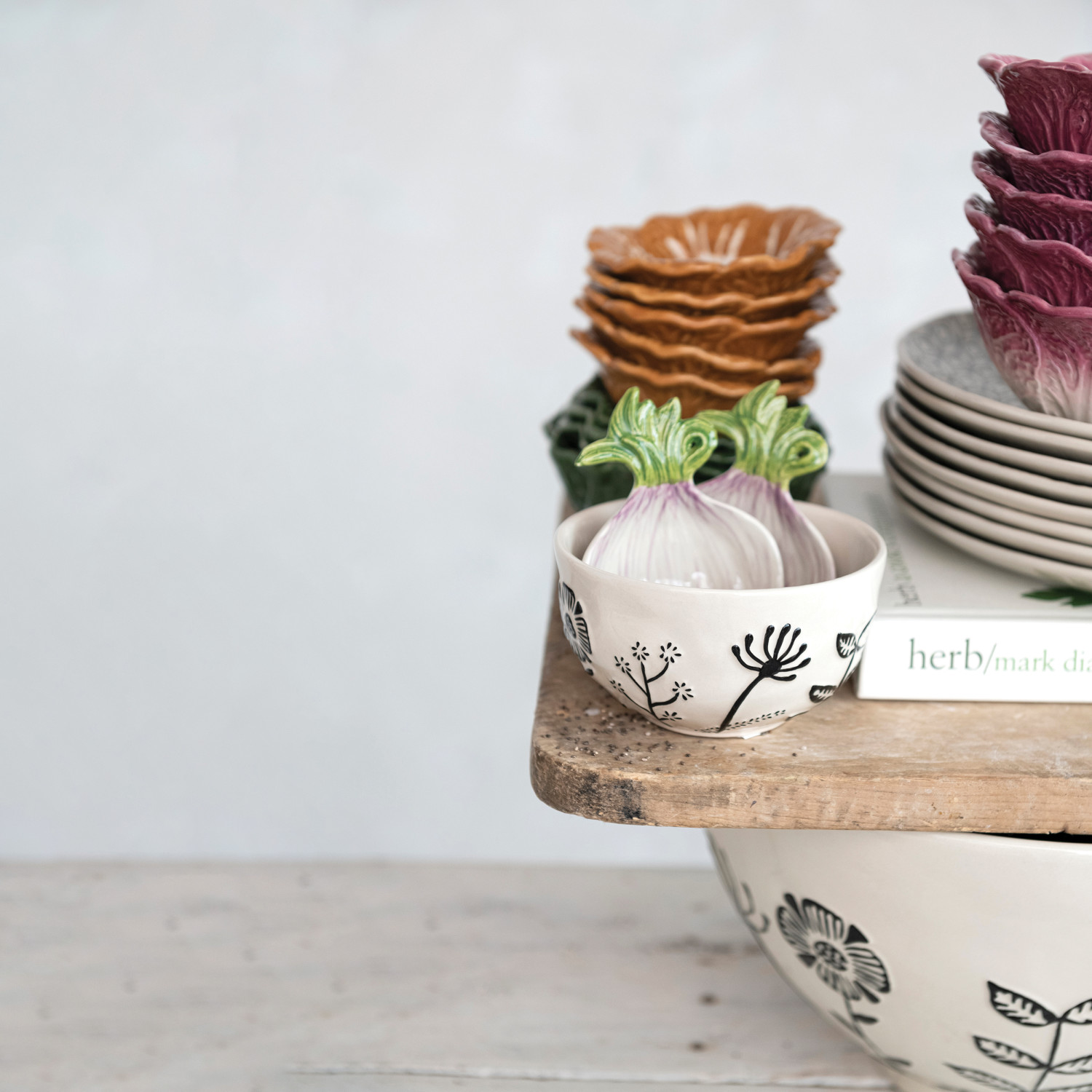 Catalog Name: 4-1/2" Round x 2-1/4"H Hand-Painted Stoneware Bowl w/ Embossed Flowers, Cream Color & Black