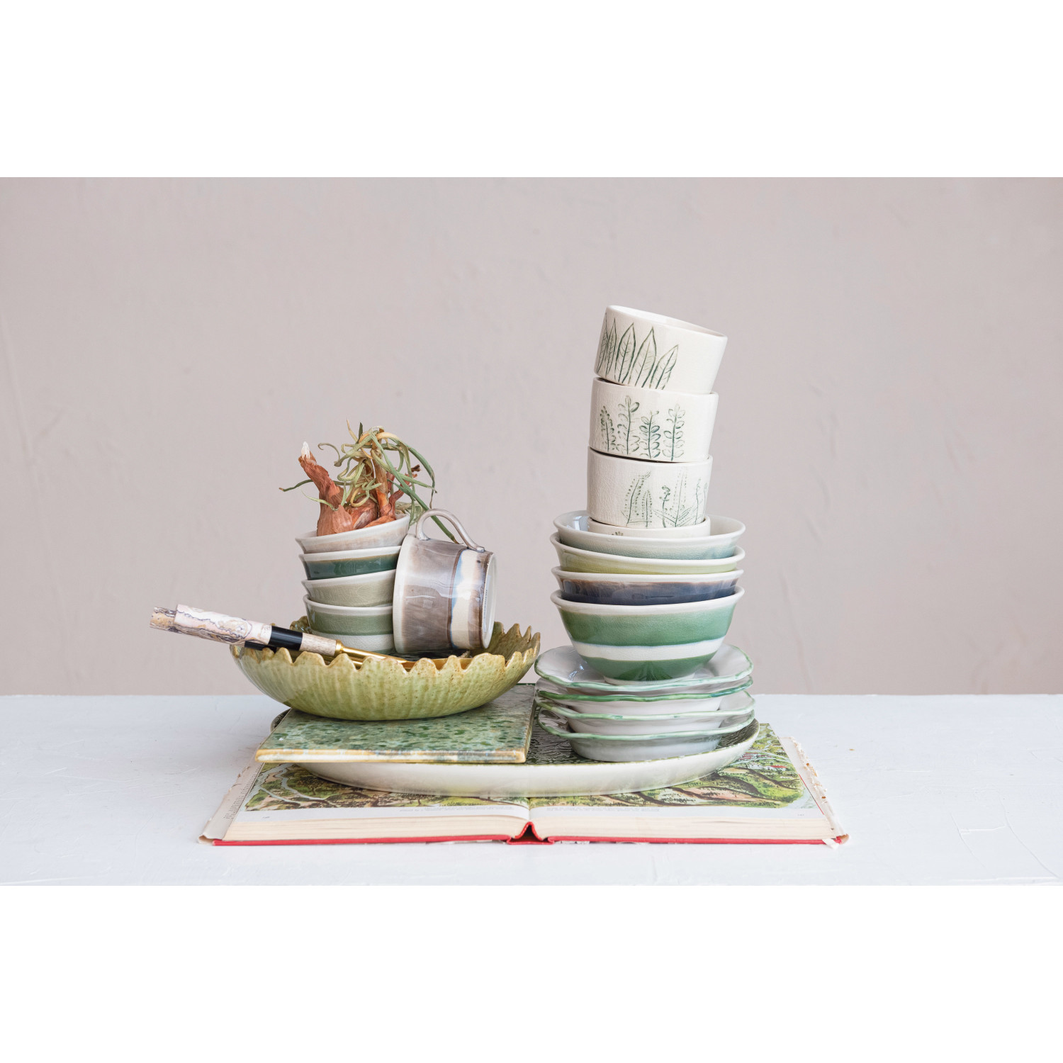 Catalog Name: 3-3/4" Round x 2-1/4"H Hand-Painted Stoneware Bowl w/ Botanicals, Reactive Crackle Glaze, Cream Color & Green, 4 Styles (Each One Will Vary)