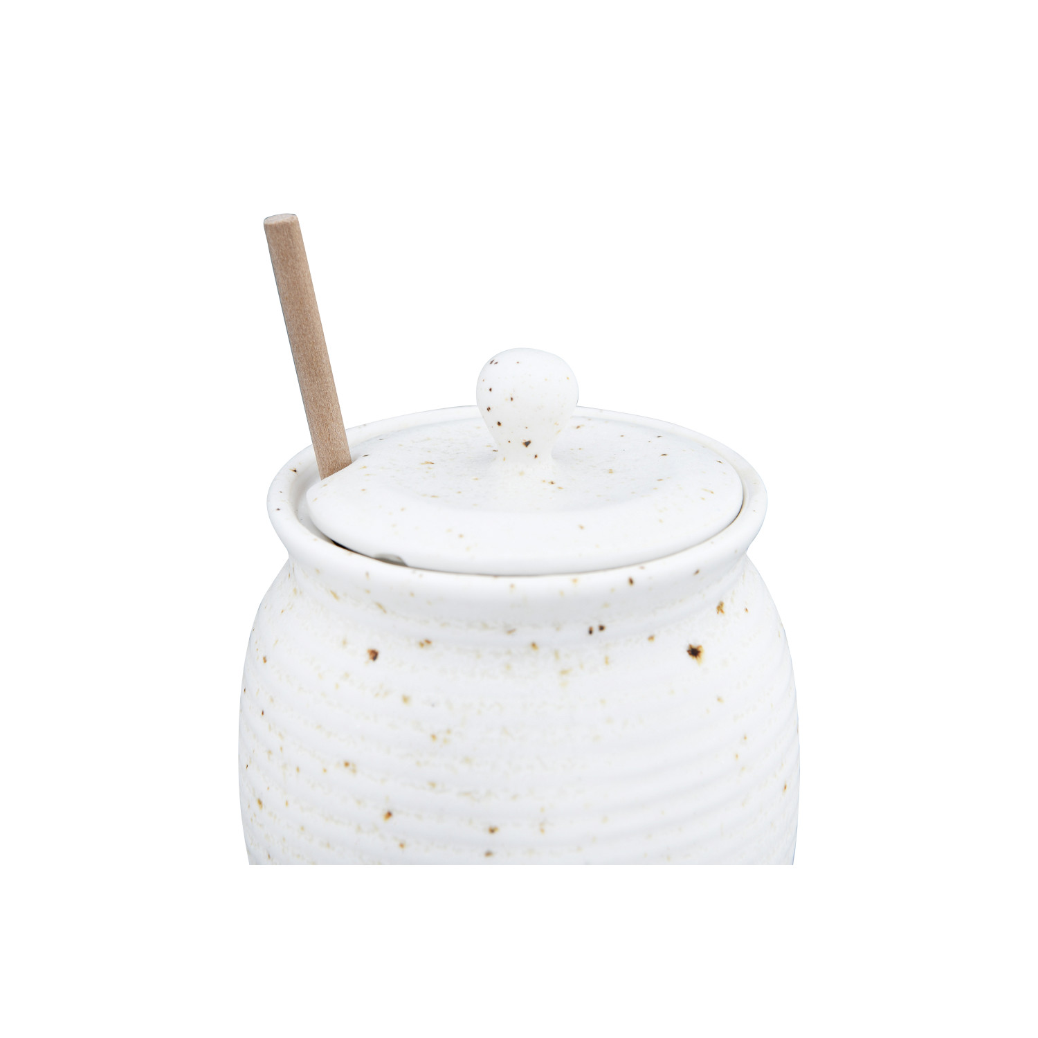 Enjoy a warm, fresh from the oven, biscuit after spreading honey on it with this special wood honey dipper. It comes with an off-white stoneware honey jar and lid. The lid allows the end of the dipper to stay inside the container while the handle peeks out through the small opening in the lid.