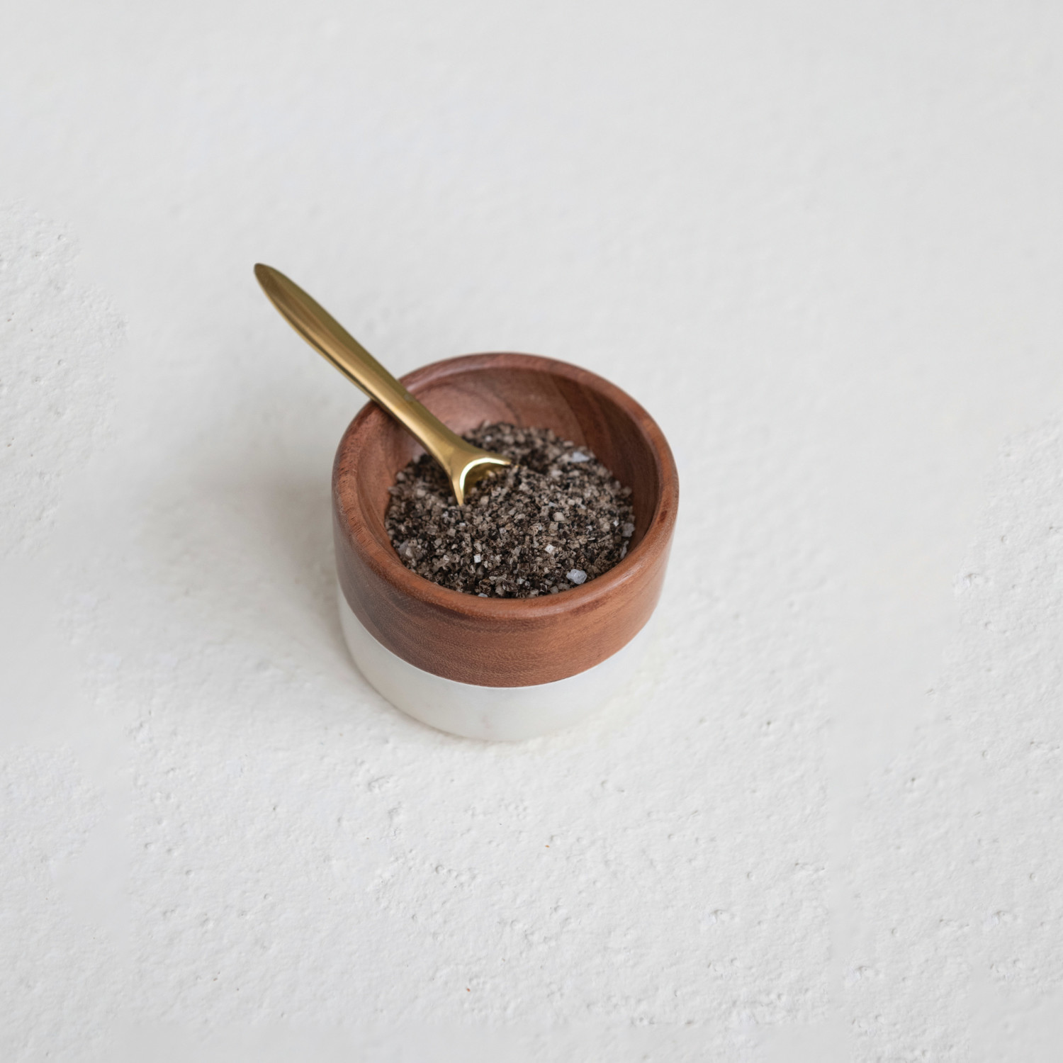 This contemporary pinch pot features contrasting acacia wood and marble construction.