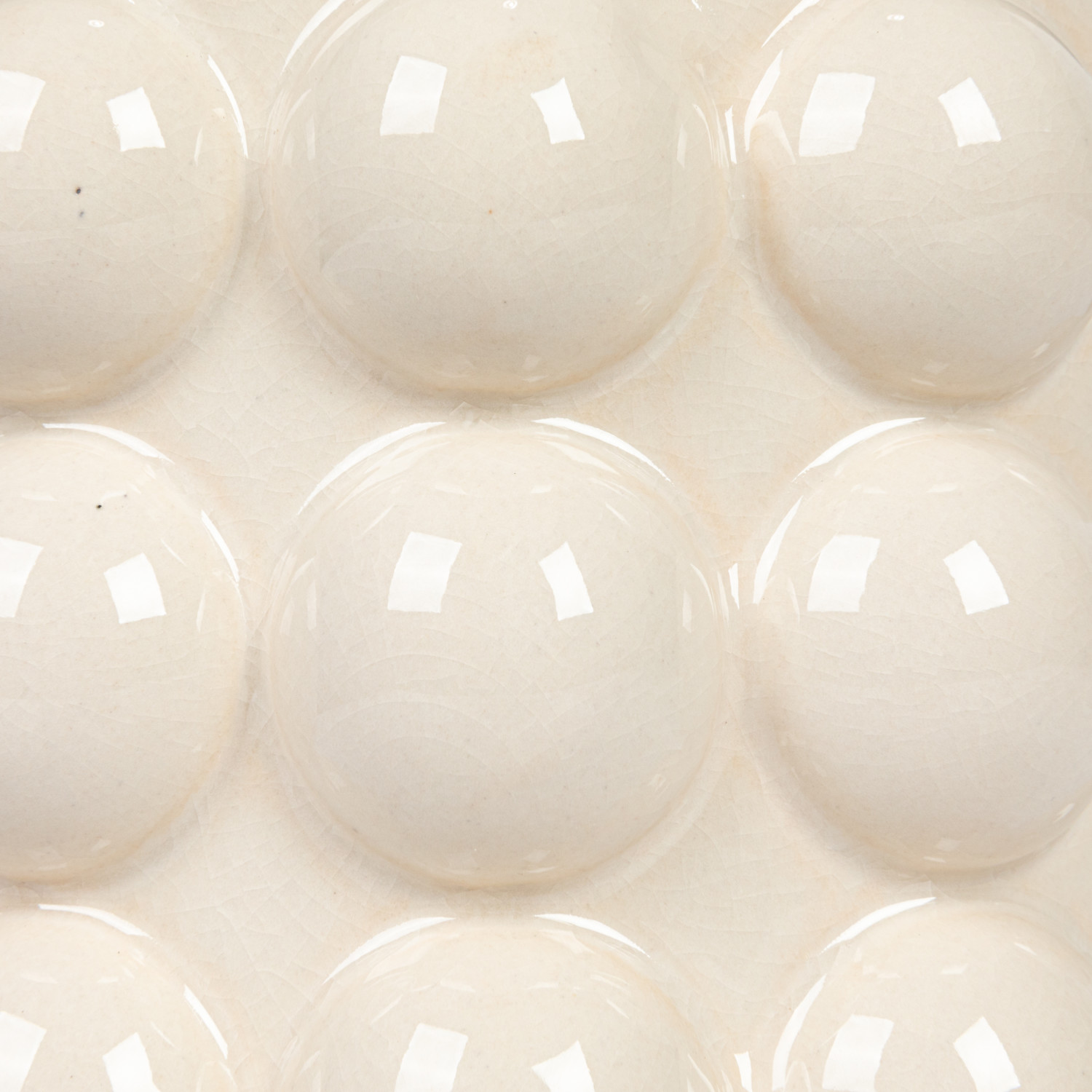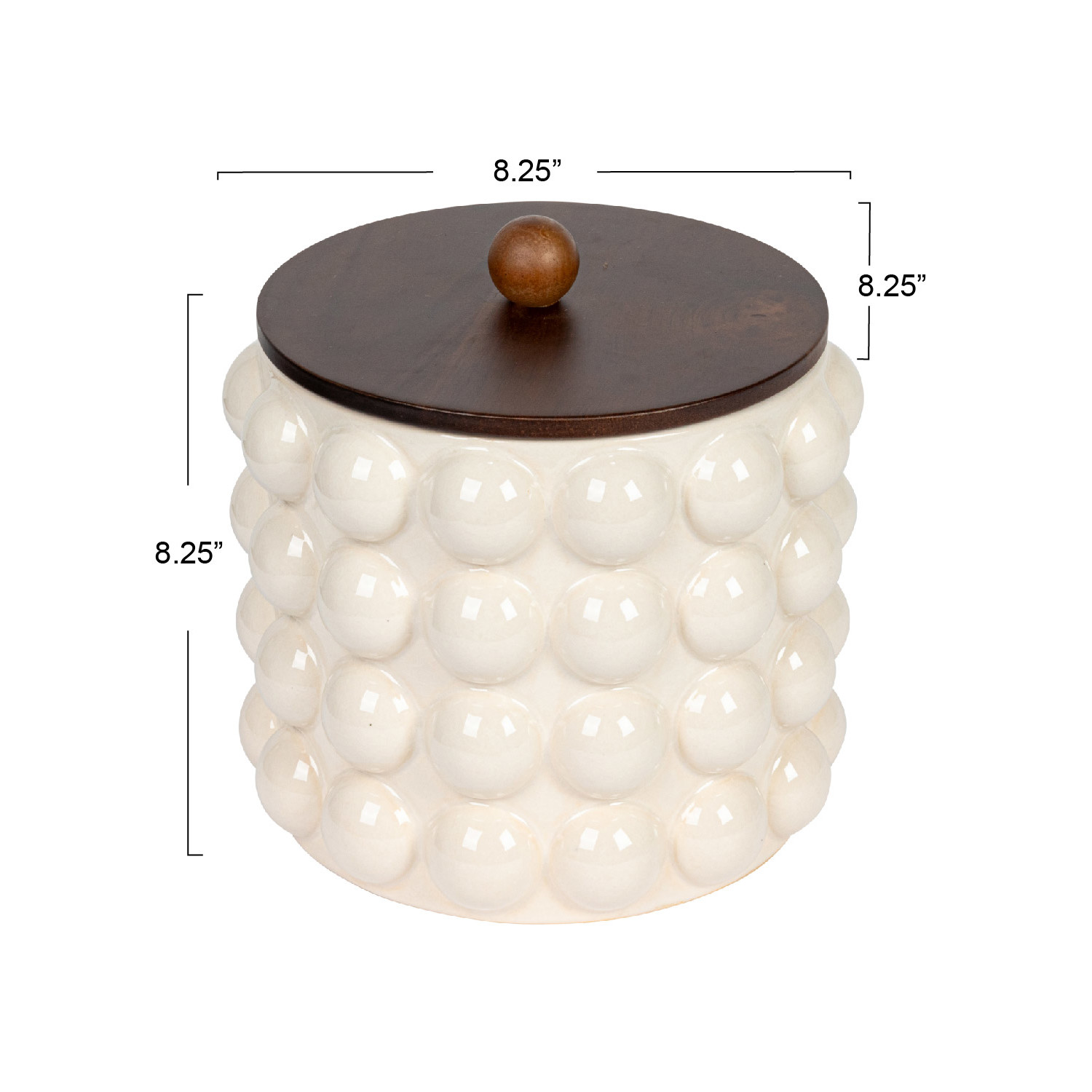 Catalog Name: 8-1/4" Round x 8-1/4"H Stoneware Canister w/ Raised Dots & Acacia Wood Lid, Crackle Glaze, White & Natural (Each One Will Vary)