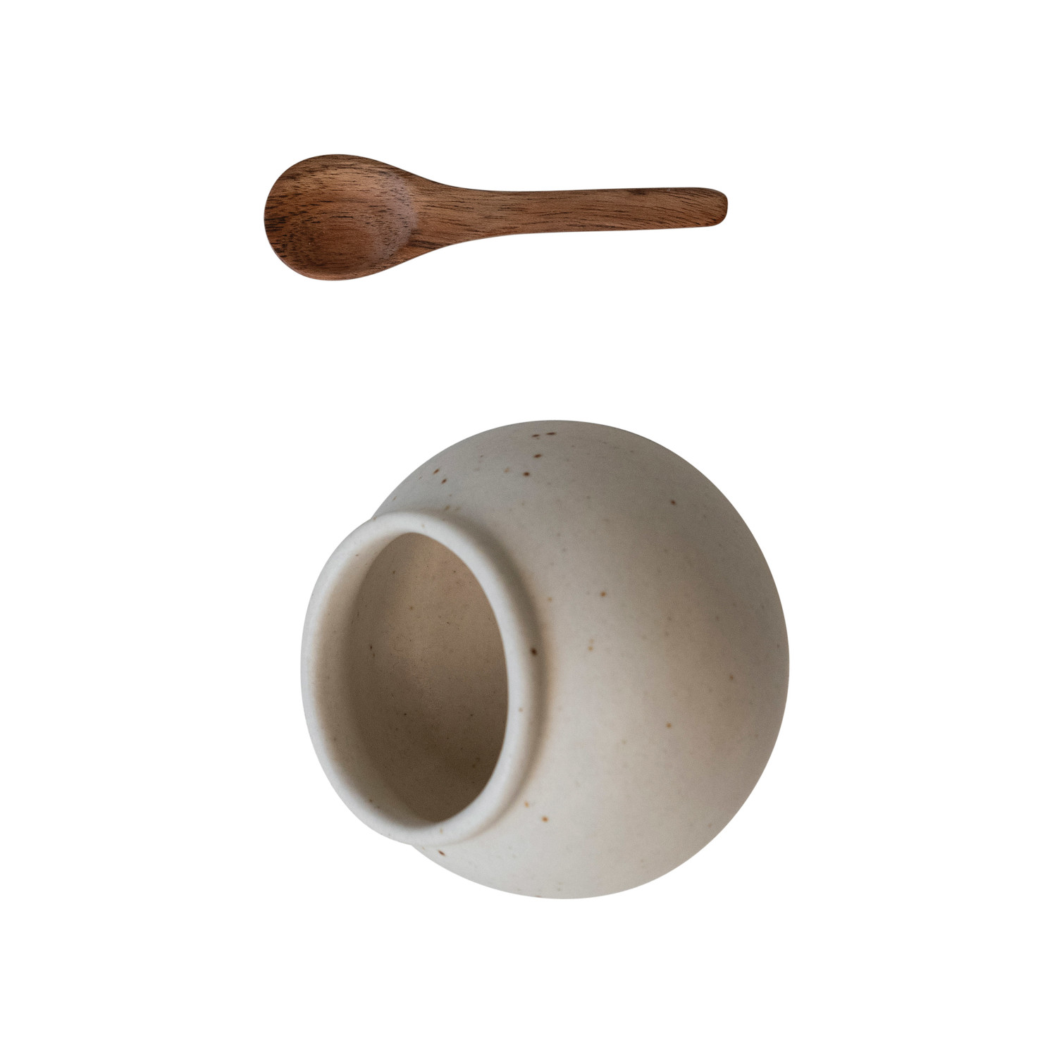 Catalog Name: 3-1/2" Round x 3"H Stoneware Salt Cellar w/ Mango Wood Spoon, Cream Color Speckled & Natural, Set of 2
