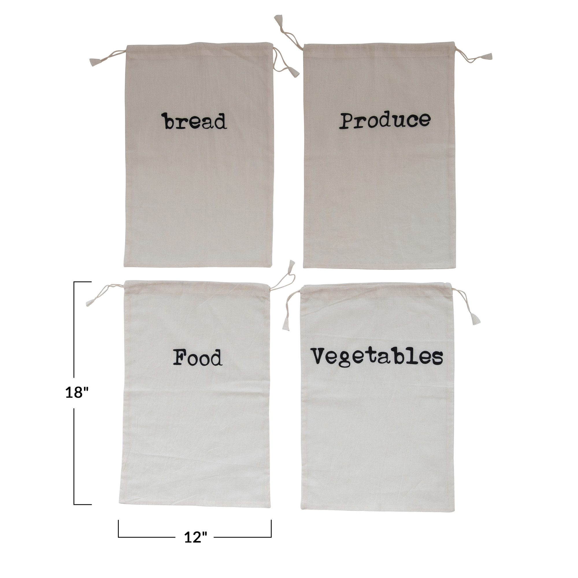 Catalog Name: 12"L x 18"H Cotton Printed Reusable Drawstring Food Bags, White & Black, 4 Styles
