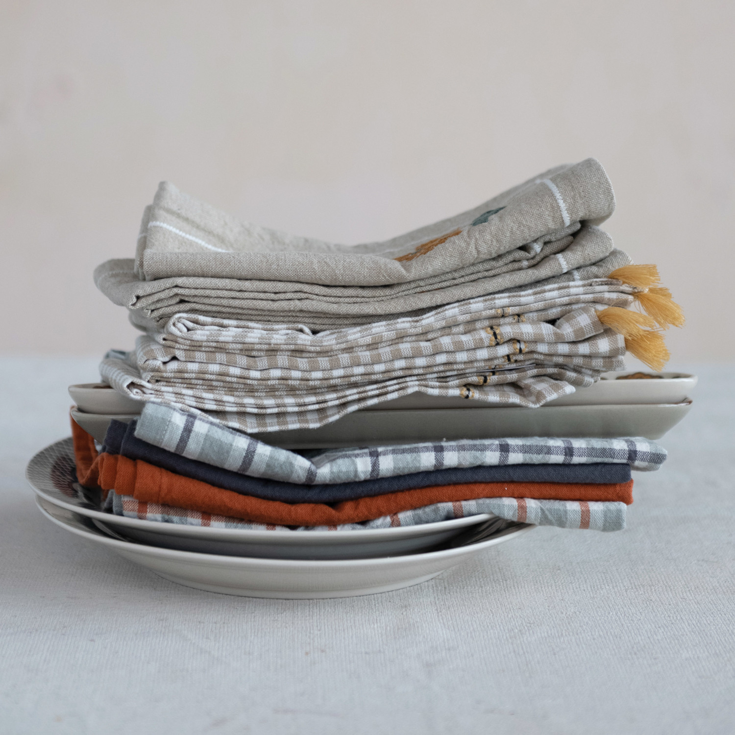 Catalog Name: 18" Square Cotton Napkins w/ Embroidery & Tassels, Mustard Color, White & Beige Gingham, Set of 4 Tied w/ Cotton Tape