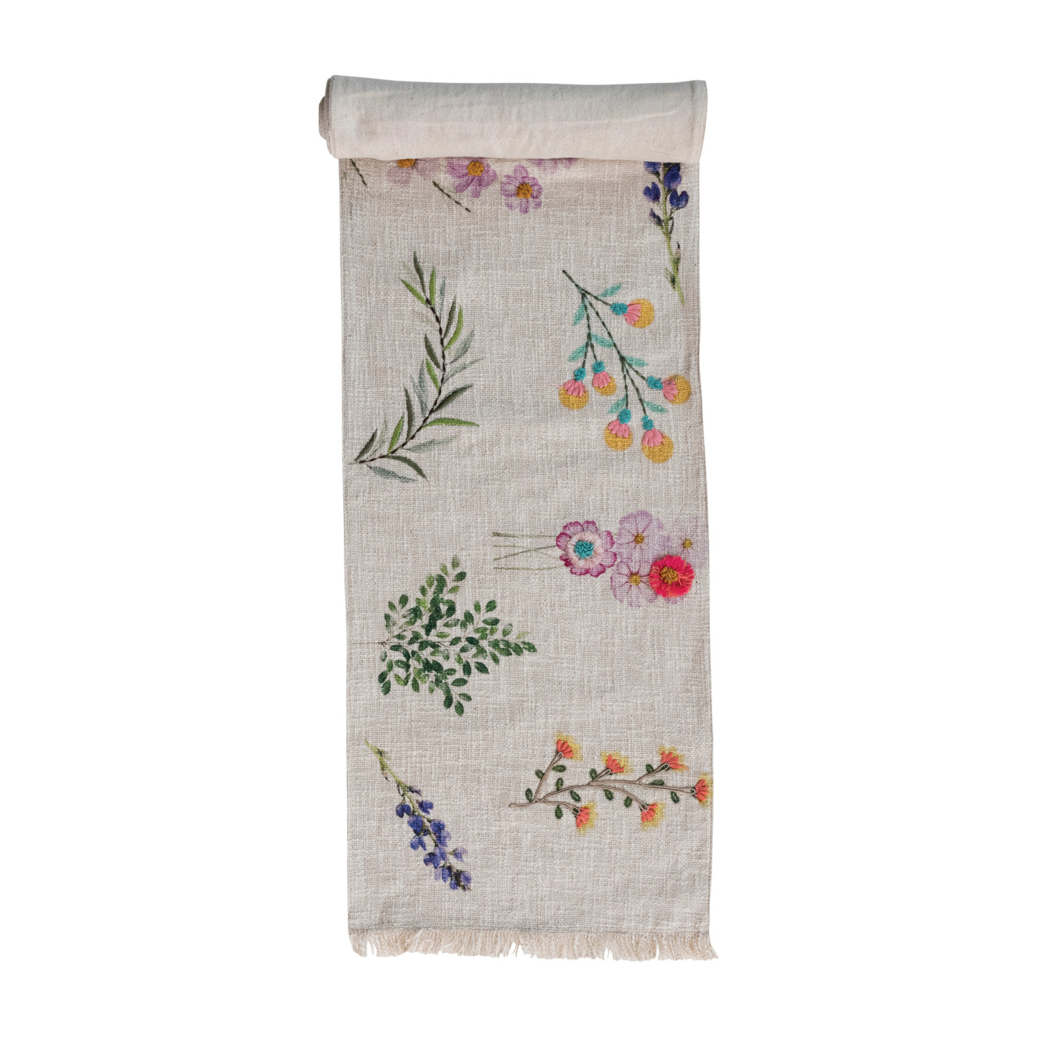 Cotton Slub Printed Table Runner w/ Flowers, Embroidery & Fringe