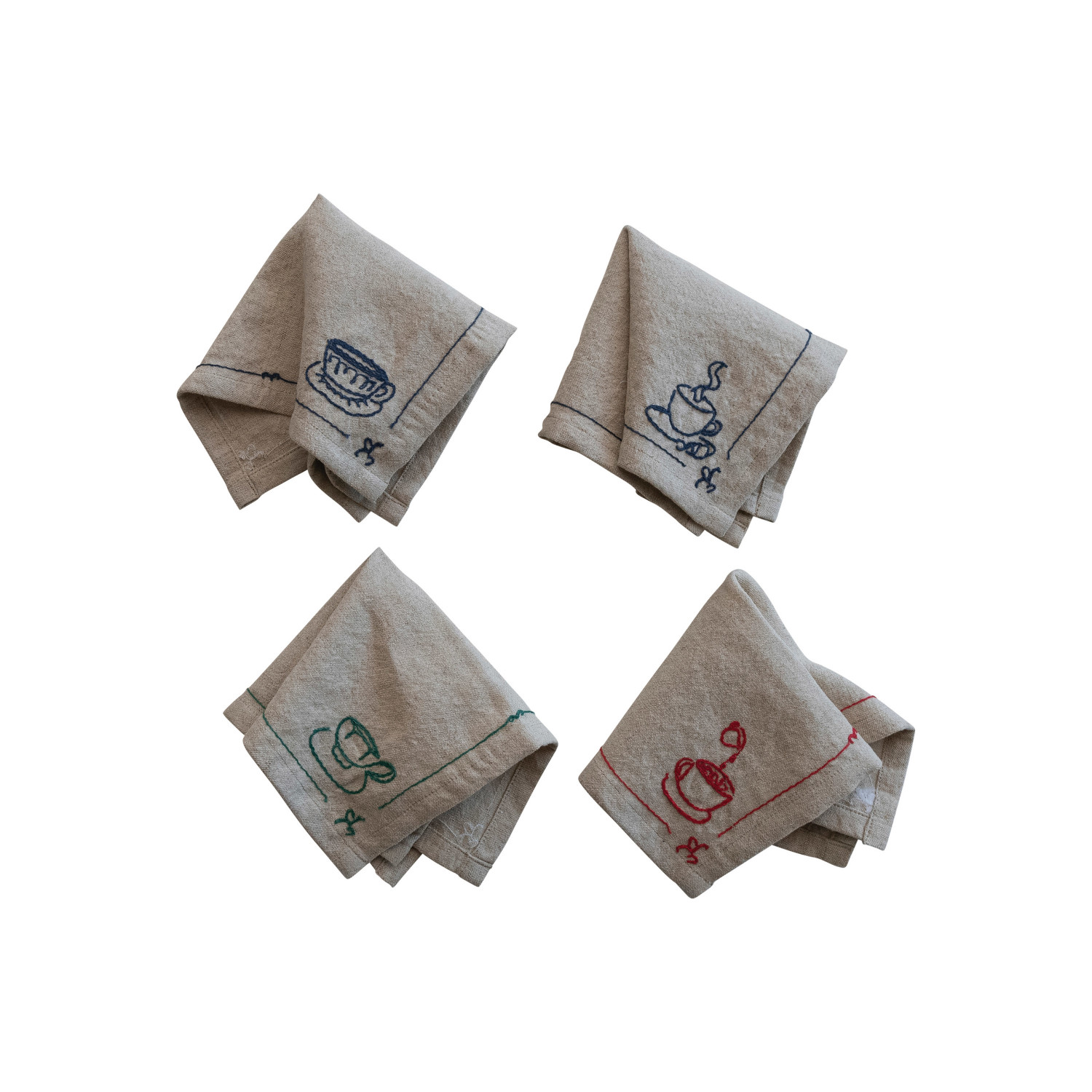 Catalog Name: 10" Square Woven Cotton & Linen Cocktail Napkins w/ Embroidered Coffee/Tea, 3 Colors, Set of 4