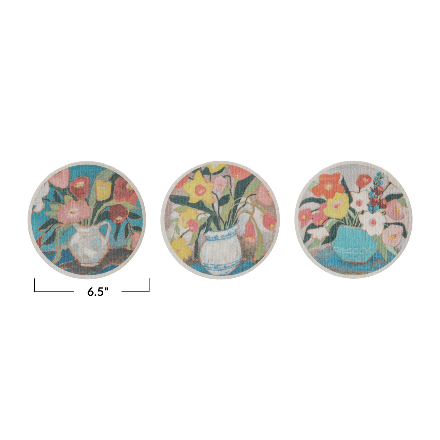 Catalog Name: 6-1/2" Round Reusable Cellulose Sponge Cloth w/ Flowers in Vase, Multi Color, 3 Styles ©