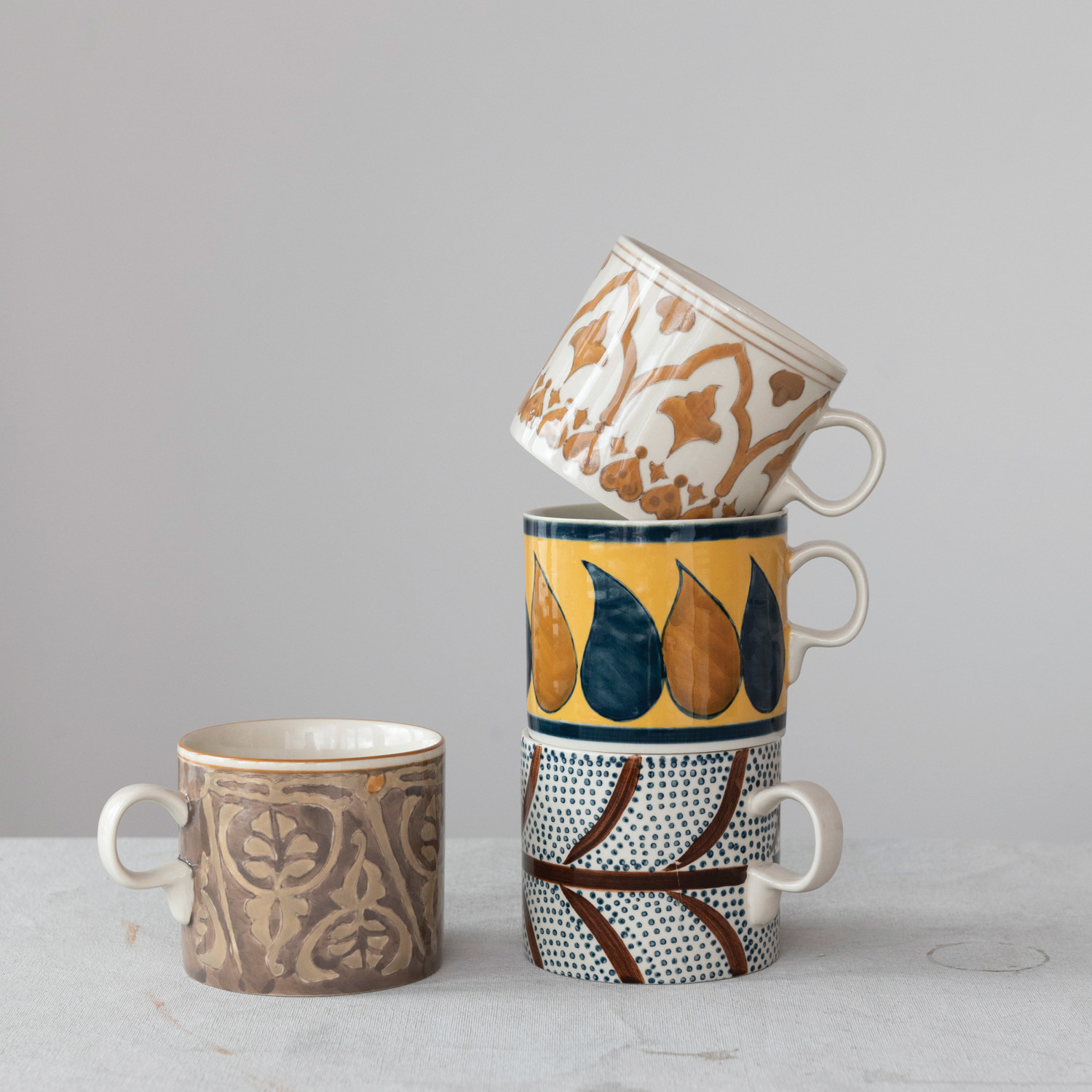 16 oz. Hand-Painted Stoneware Mug w/ Pattern, 4 Styles
