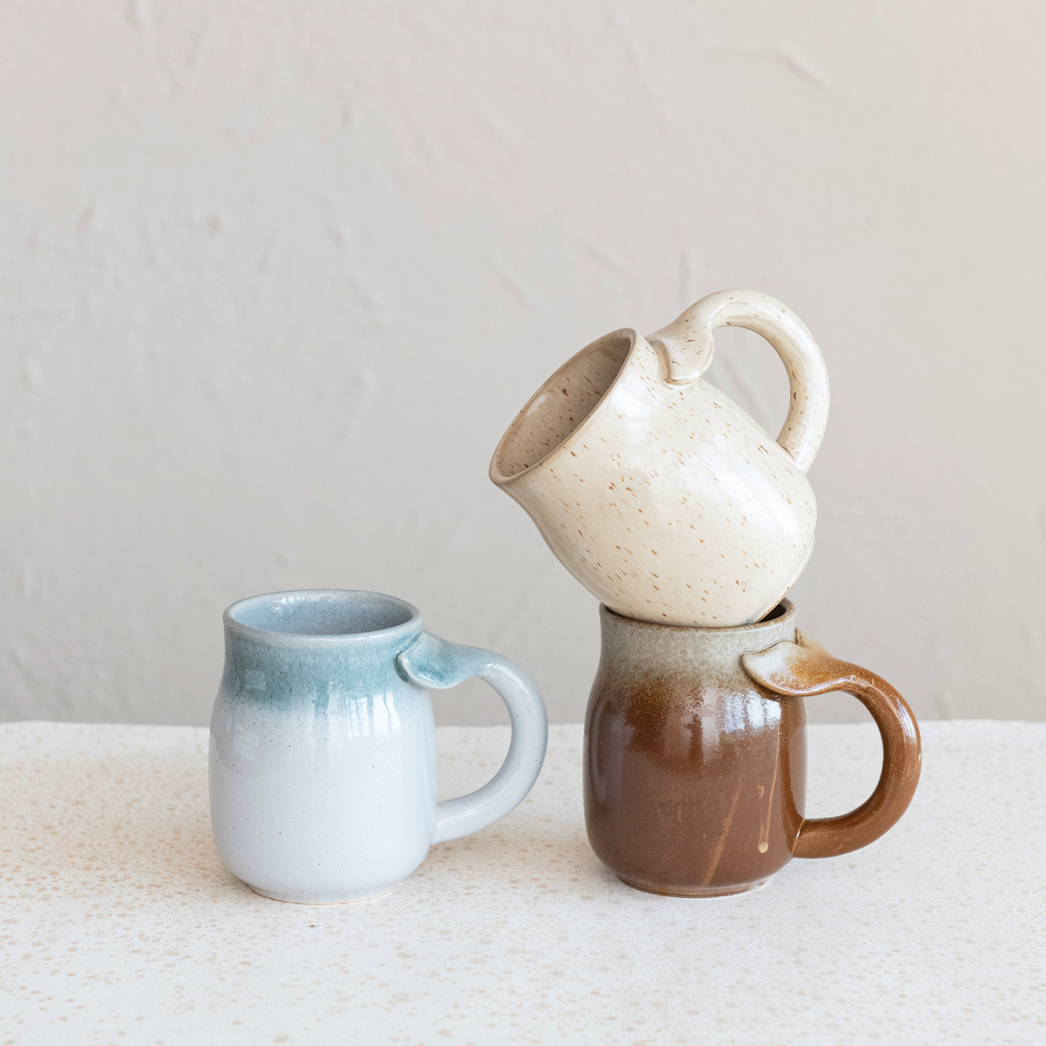 Catalog Name: 3-3/4" Round x 4-1/2"H 16 oz. Stoneware Mug w/ Whale Tail Handle, Reactive Glaze, 3 Colors (Each One Will Vary)