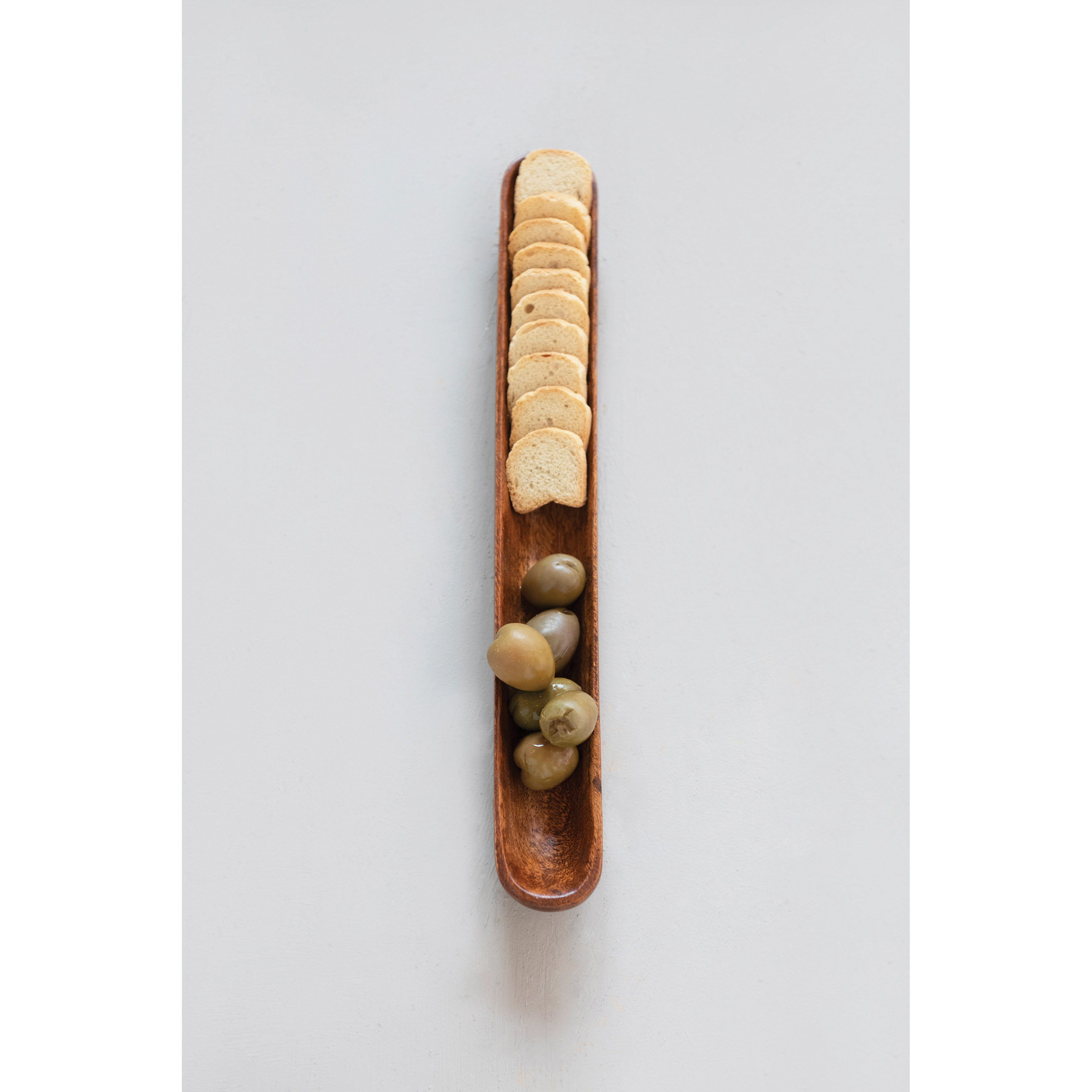 Acacia wood olive bowl in a natural finish. Elegantly display hors d'oeuvres, candies, or decorative filler in this striking olive boat. Made from 100% acacia wood. Curate a space that reflects your unique sense of style with intentionally designed home décor.