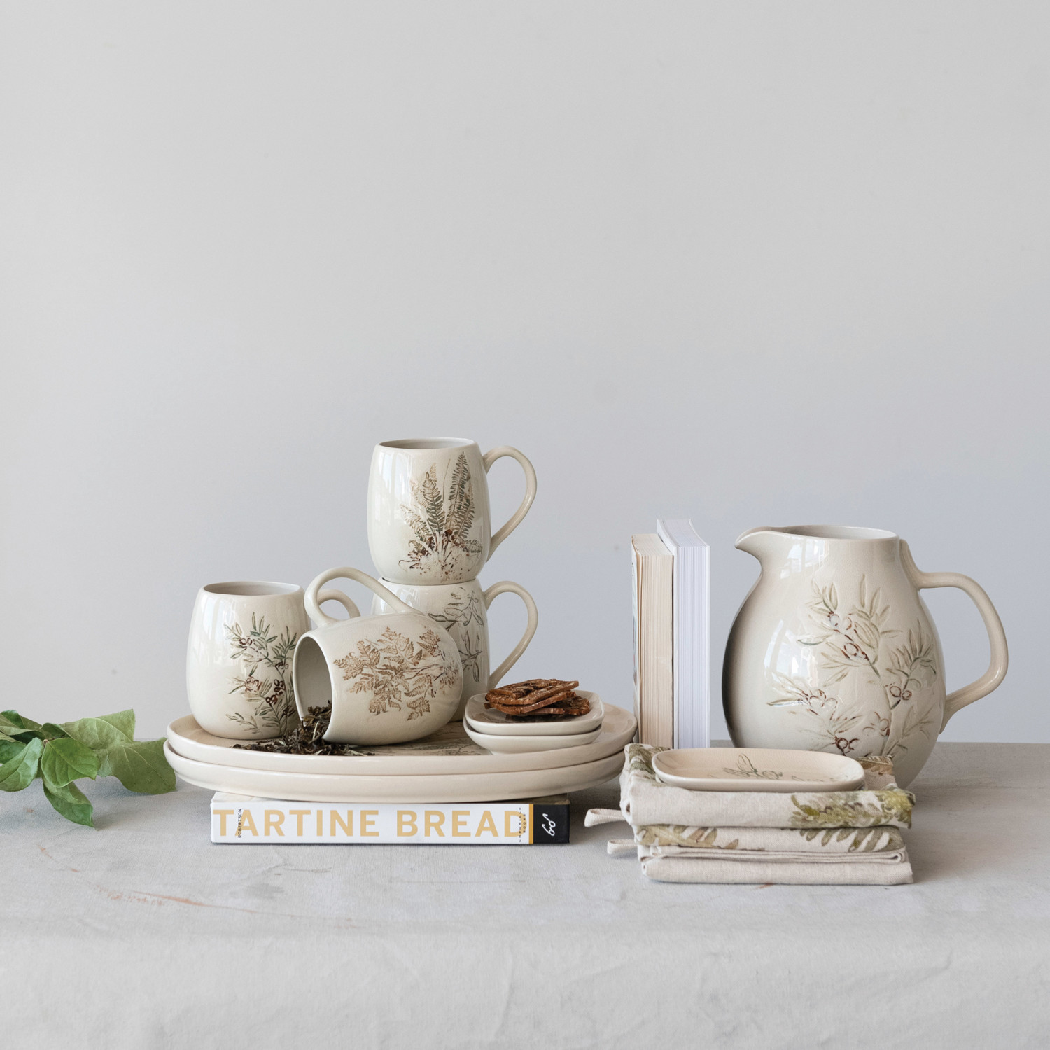 This elegant set of dishes showcases a delicate debossed botanical design in a naturally variating reactive glaze.