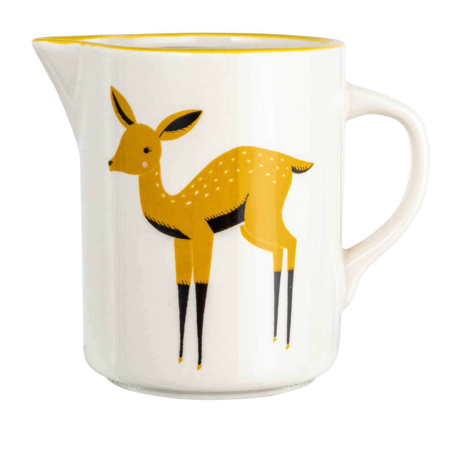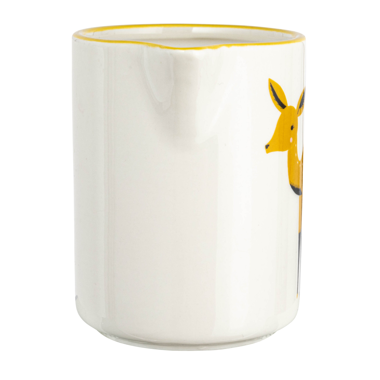 Our thoughtfully crafted collection of serve ware showcases an expansive selection of natural materials and artisanal silhouettes that are all intentionally designed for the modern host. Elevate gatherings of friends and family with an offering of stylishly versatile pieces including serving bowls, pitchers, platters, crocks, ladles, salt and pepper shakers, pinch pots, tiered trays, creamers, appetizer boards, serving trays, so much more. Choose from a wide array of materials from marble to wood, and styles from rustic and modern to farmhouse and glam. Curate a dazzlingly elegant display for a dinner party, or simply add a touch of style to daily rituals with a piece that is sure to impress. This cottage-inspired stoneware creamer features an intricately painted deer and yellow rim. This piece is food safe. Dishwasher safe. Made from stoneware.