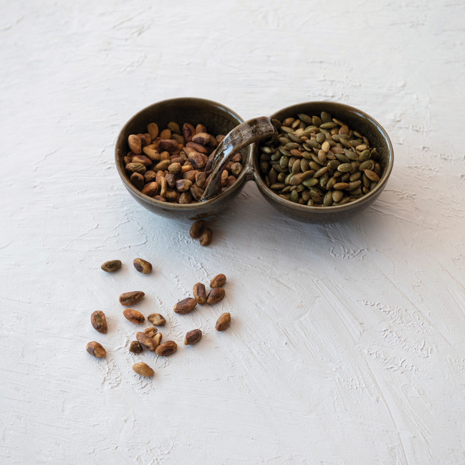 Our thoughtfully crafted collection of serve ware showcases an expansive selection of natural materials and artisanal silhouettes that are all intentionally designed for the modern host. Elevate gatherings of friends and family with an offering of stylishly versatile pieces including serving bowls, pitchers, platters, crocks, ladles, salt and pepper shakers, pinch pots, tiered trays, creamers, appetizer boards, serving trays, so much more. Choose from a wide array of materials from marble to wood, and styles from rustic and modern to farmhouse and glam. Curate a dazzlingly elegant display for a dinner party, or simply add a touch of style to daily rituals with a piece that is sure to impress. This farmhouse-inspired stoneware appetizer dish showcases 2 sections and an organically shaped handle in a naturally variating reactive glaze. This piece is food safe. Dishwasher safe. Made from stoneware.