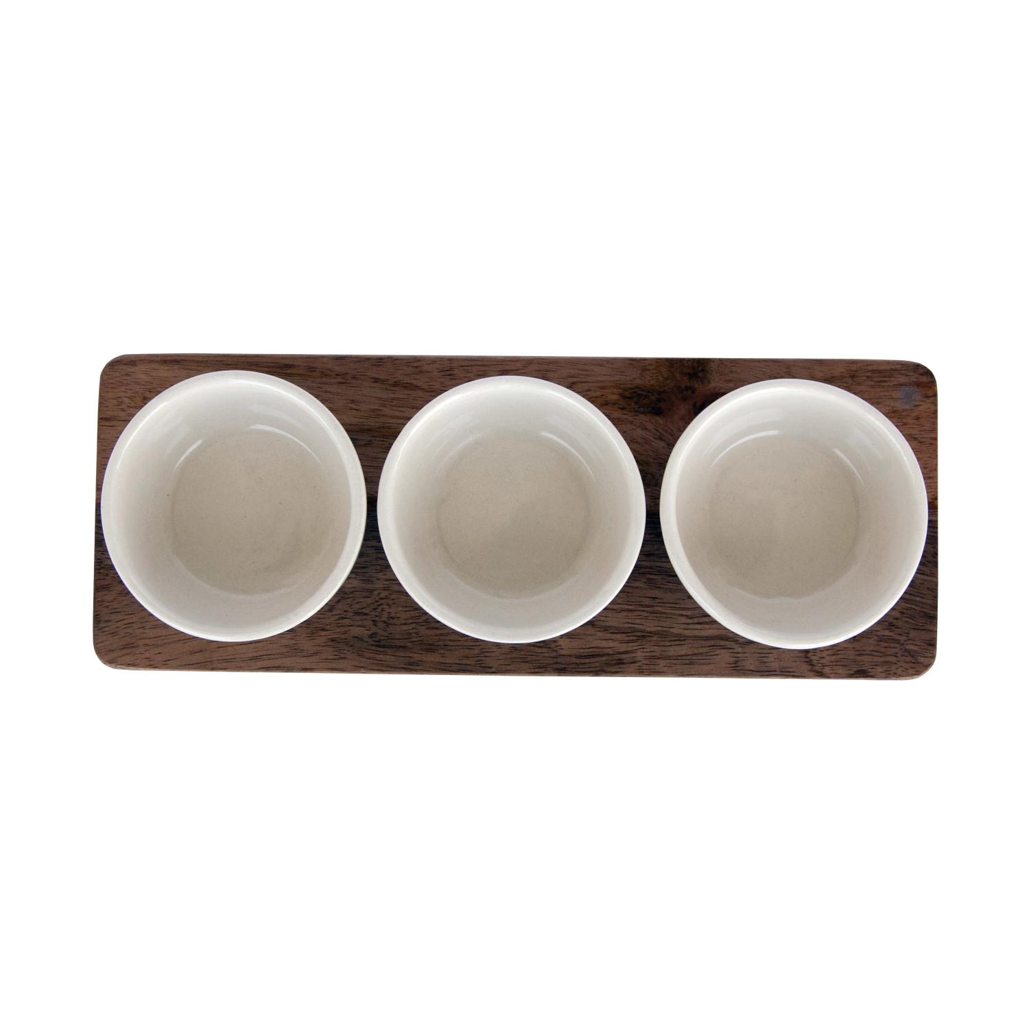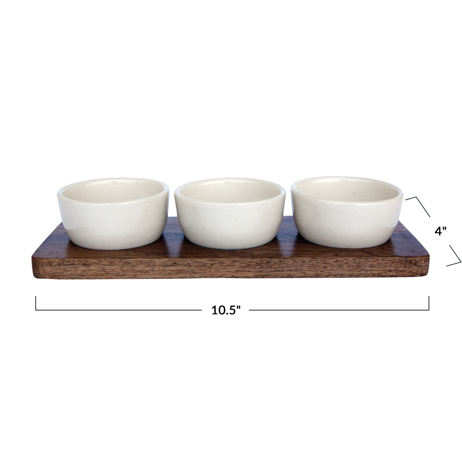 Catalog Name: 10-1/2"L x 4"W Mango Wood Tray w/ (3) 3-1/4" Round x 1-1/2"H 2 oz. Stoneware Bowls, Natural & Cream Color, Set of 4