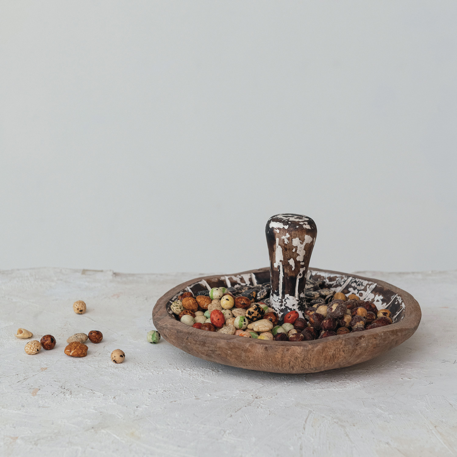 Catalog Name: 11"L x 10-1/2"W x 5"H Decorative Carved Mango Wood Mushroom Shaped Tray w/ Stem, Distressed Finish, Natural, Brown & White