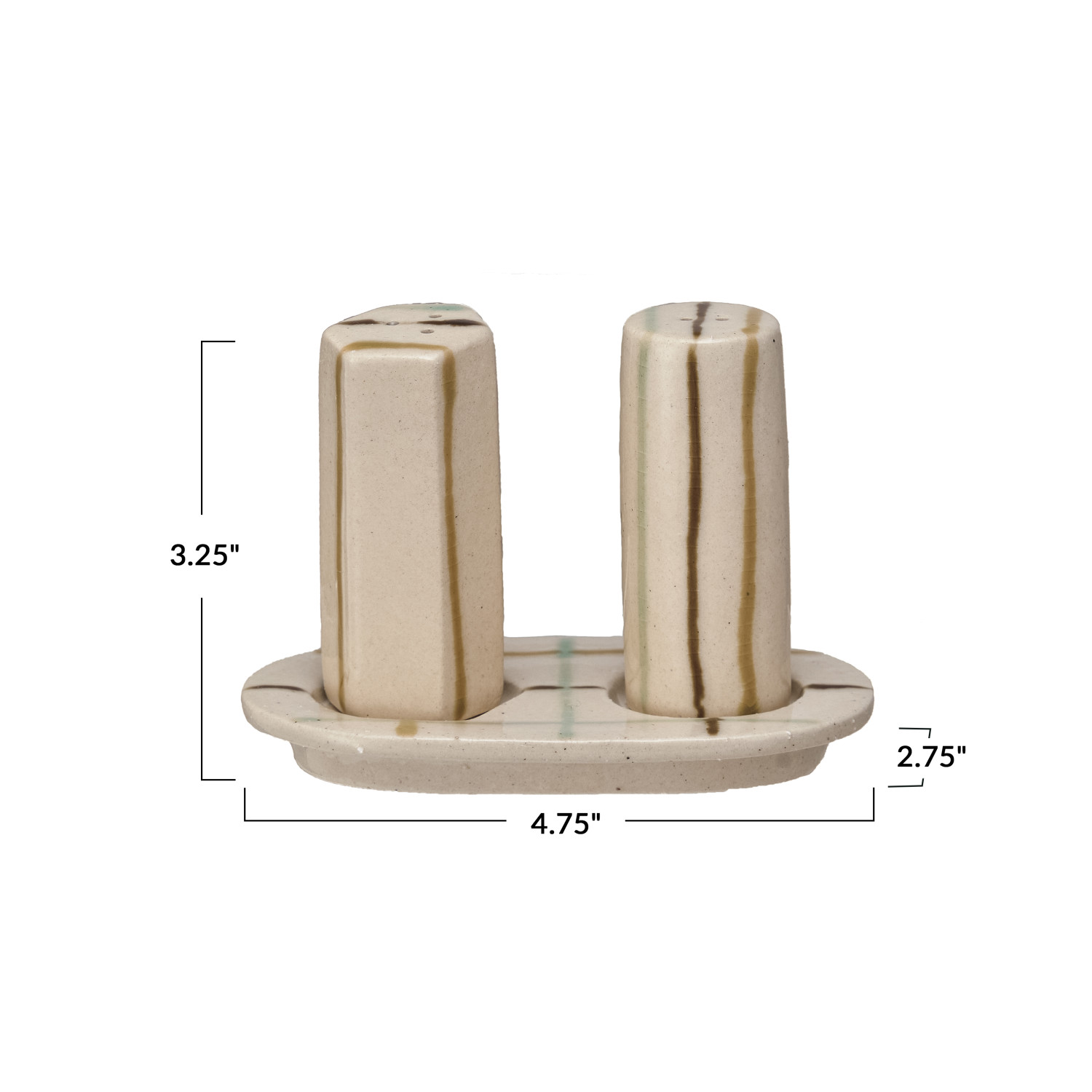 Catalog Name: 4-3/4"L x 2-3/4"W x 3-1/4"H Hand-Painted Stoneware Salt & Pepper Shakers w/ Grid Pattern & Tray, Reactive Crackle Glaze, Multi Color, Set of 3 (Each One Will Vary)