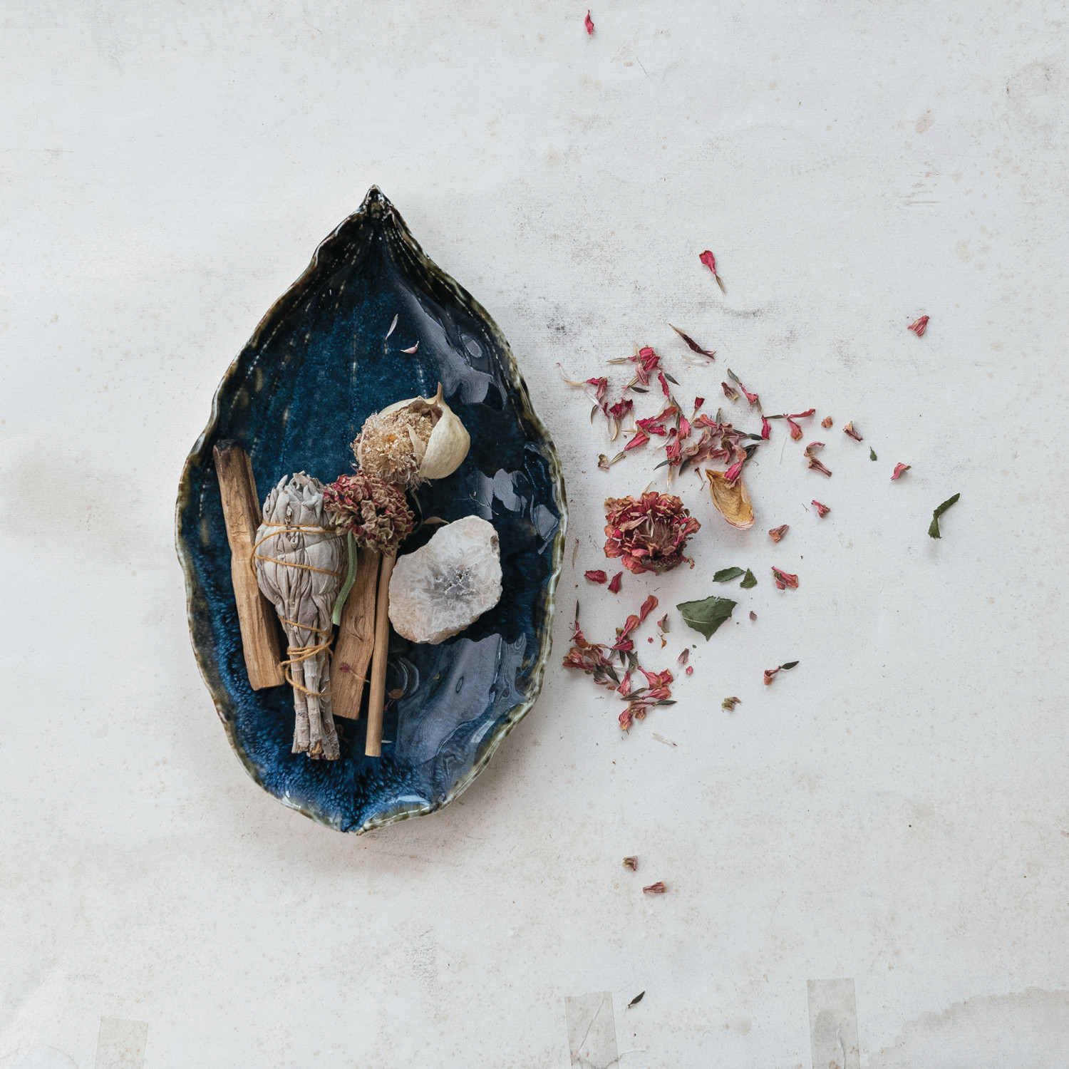 Catalog Name: 10-1/4"L x 6-1/4"W Stoneware Leaf Shaped Plate, Reactive Crackle Glaze, Blue (Each One Will Vary)