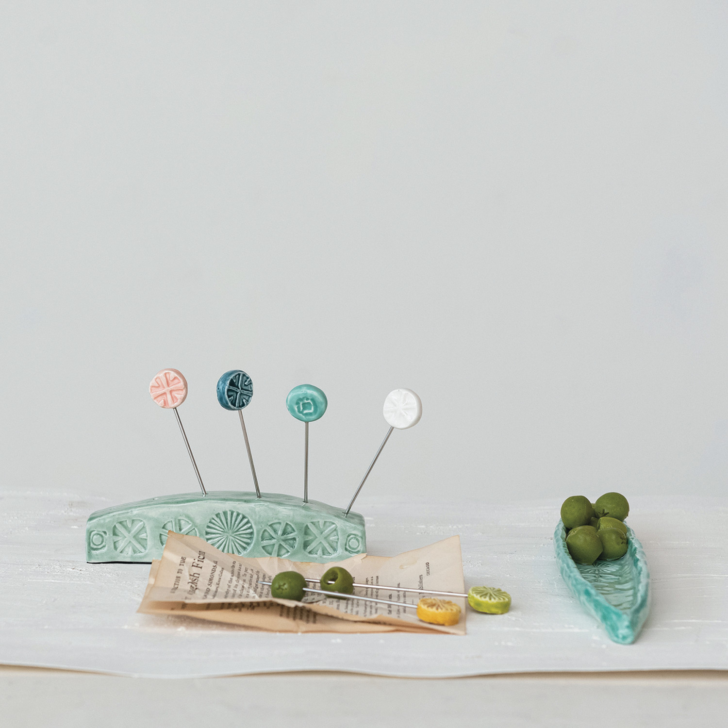 Catalog Name: 12"L x 1-3/4"W Hand-Painted Debossed Stoneware Olive Dish, Aqua ©