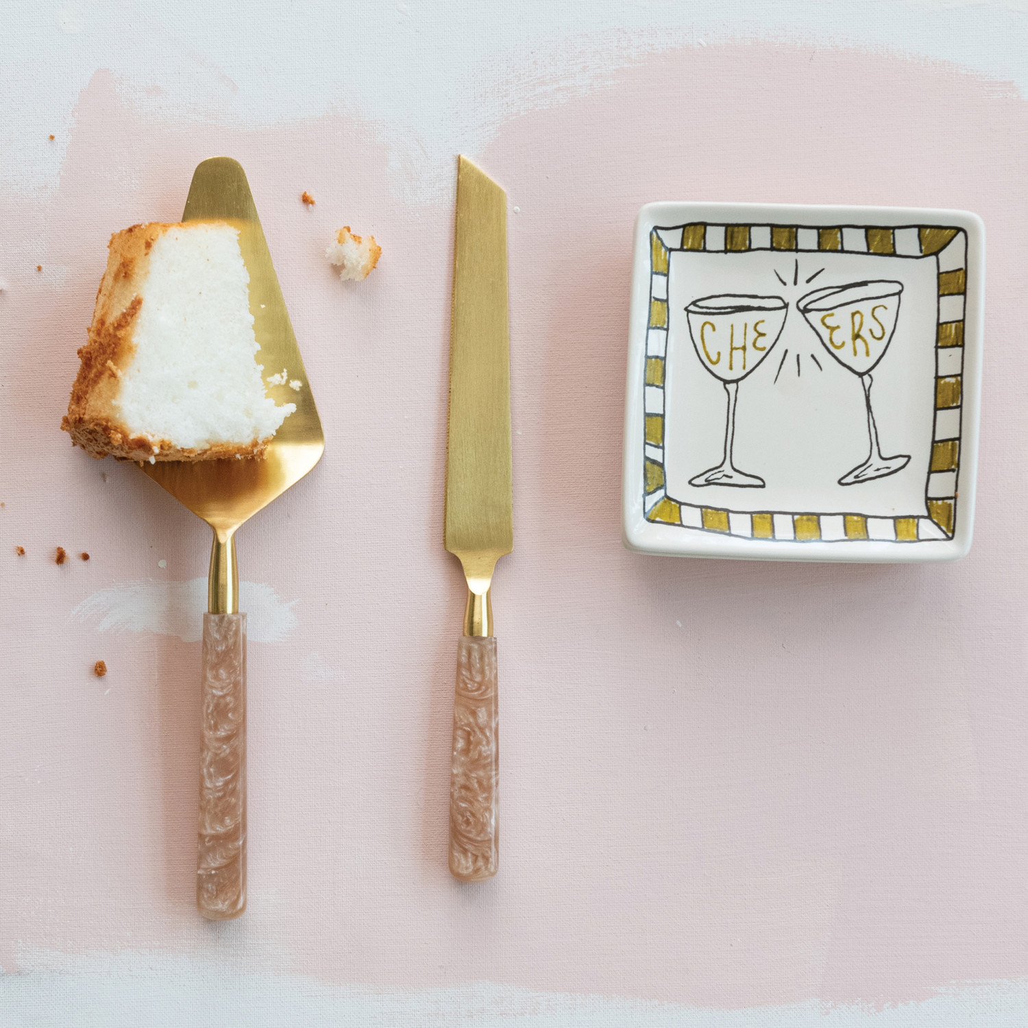 Catalog Name: 10-3/4"L Stainless Steel Cake Servers w/ Marbled Resin Handles, Gold Finish & Blush Color, Boxed Set of 2 (Each One Will Vary)