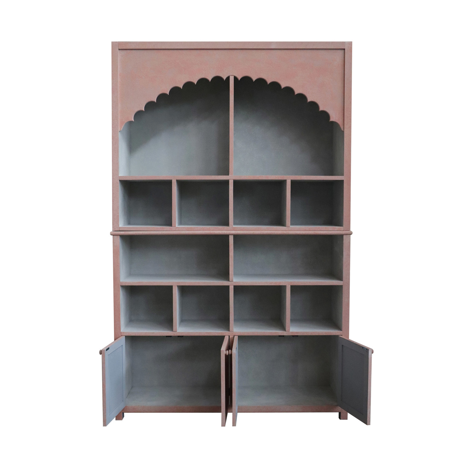 Catalog Name: 59-1/2"W x 15-3/4"D x 94-1/2"H Wood & MDF Cabinet w/ Scalloped Edge, 14 Compartments & 4 Doors, Antique Pink Finish, KD, Truck Ship