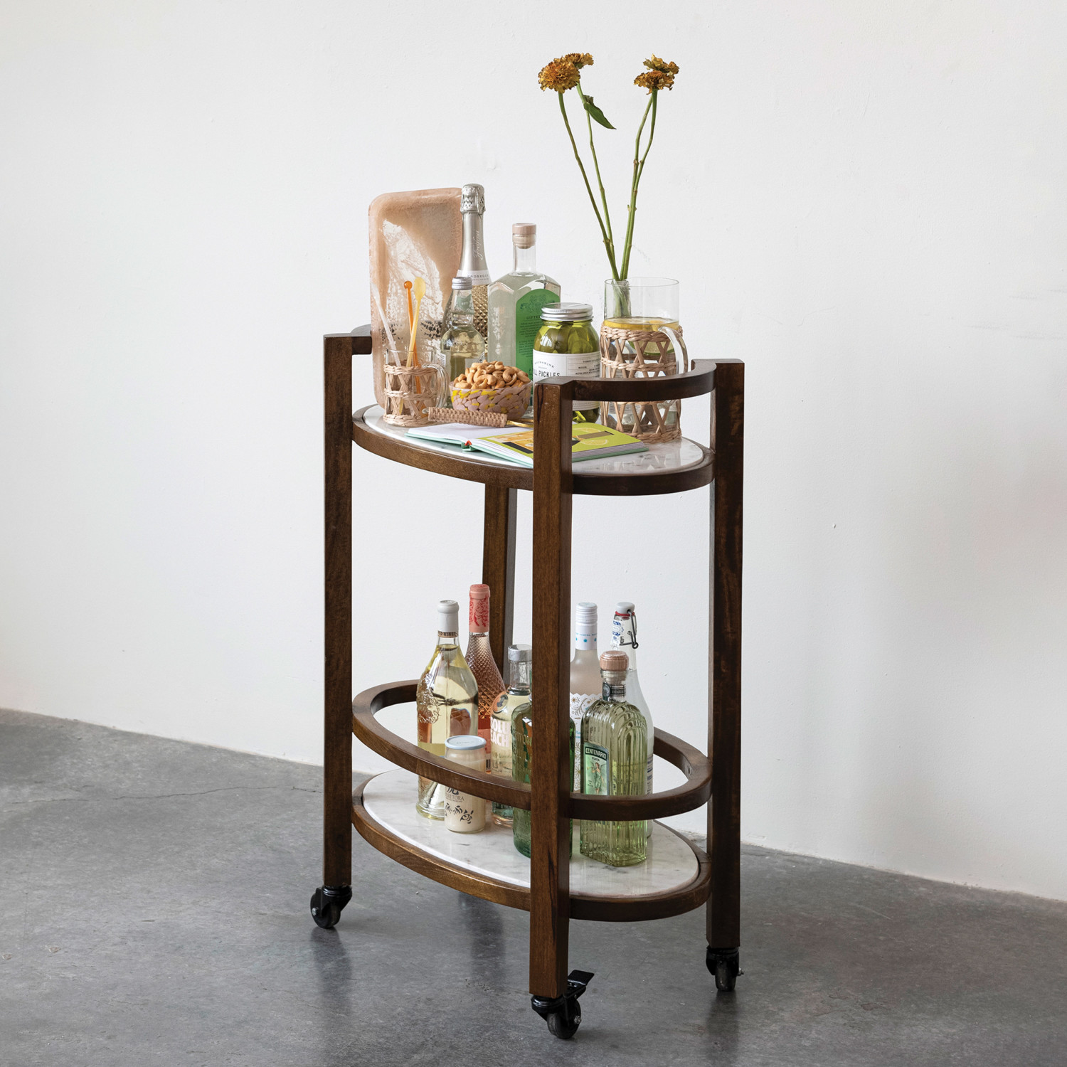 Catalog Name: 25-1/2"W x 14"D x 33-1/2"H Mango Wood 2-Tier Bar Cart on Casters w/ Marble Shelves, Walnut Finish, White, Truck Ship