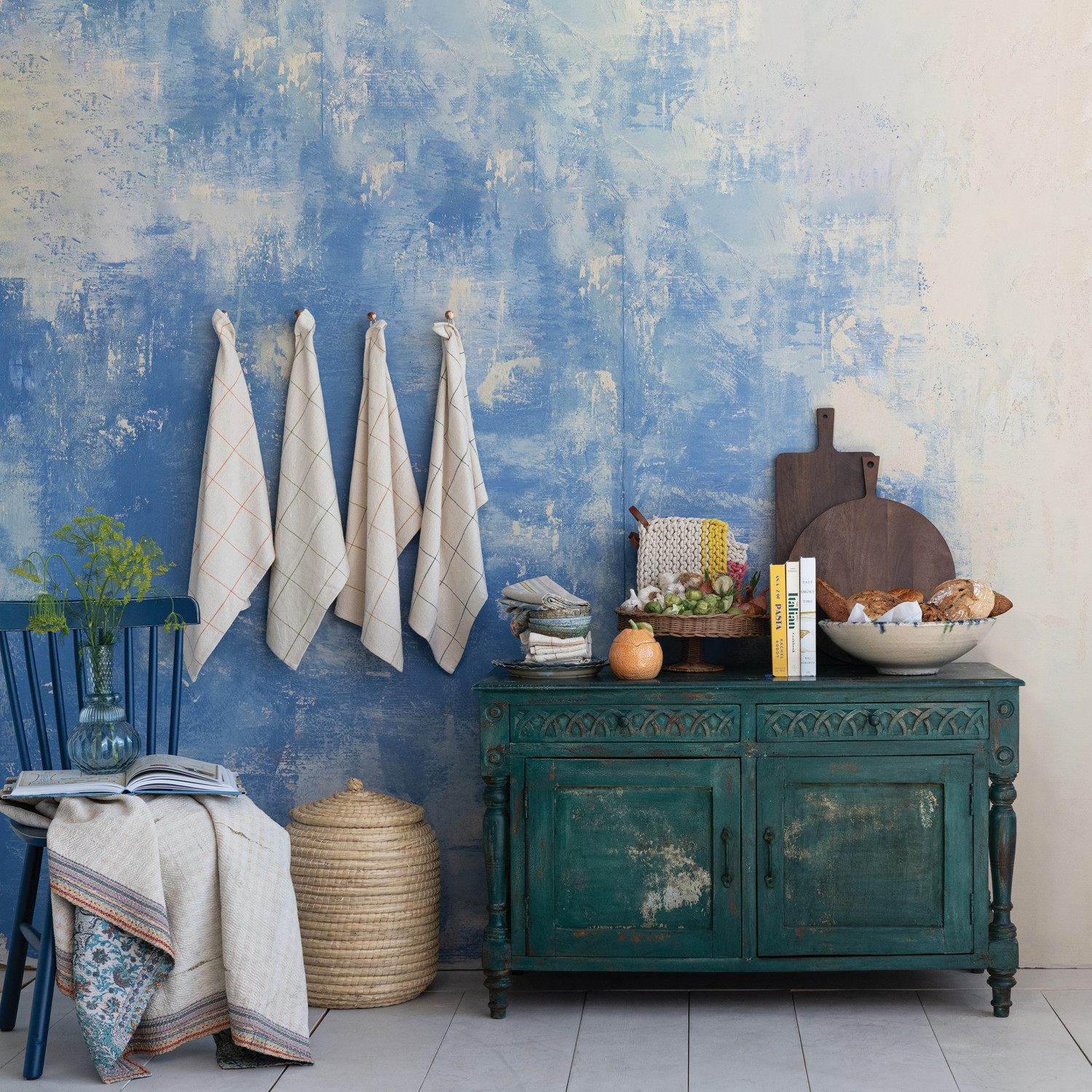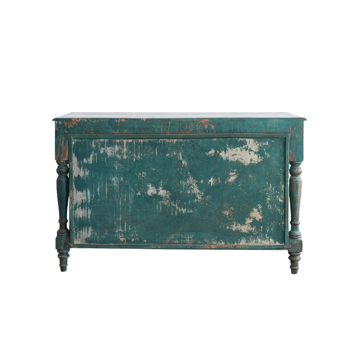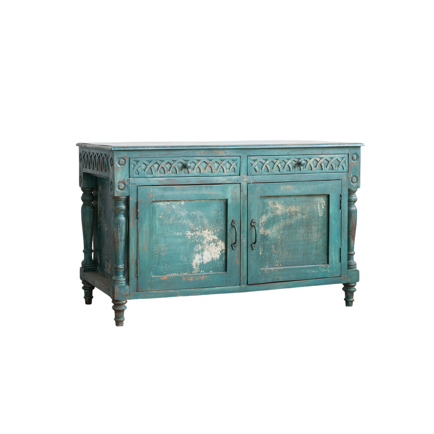 Catalog Name: 47"W x 20"D x 29"H Hand-Painted Carved Mango Wood Vintage Reproduction Cabinet w/ Turned Legs, 2 Drawers, 2 Doors & 1 Shelf, Distressed Finish, Teal, Truck Ship (Each One Will Vary)