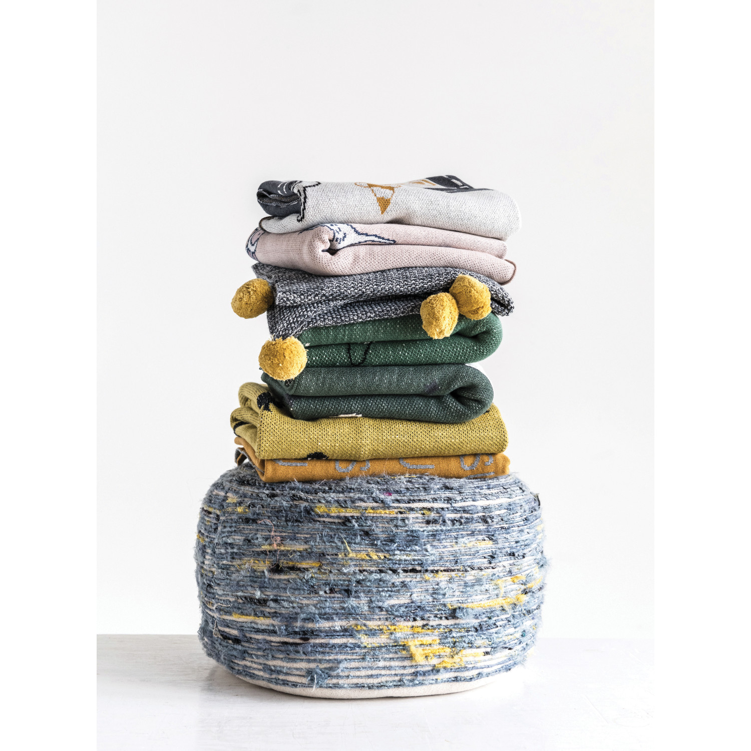 With a texture like an applique, stripes of blue, black and mustard with a solid white background create a beautiful color combination for this heavily distressed pouf. Perfect for the rustic decor, it will pair nicely with other blue or mustard accent pieces. It is an ideal piece of furniture for adding comfort when needing an extra seat or wanting to prop up tired feet. It can also make an instant side table for a tray full of snacks or a fun place to play a game.