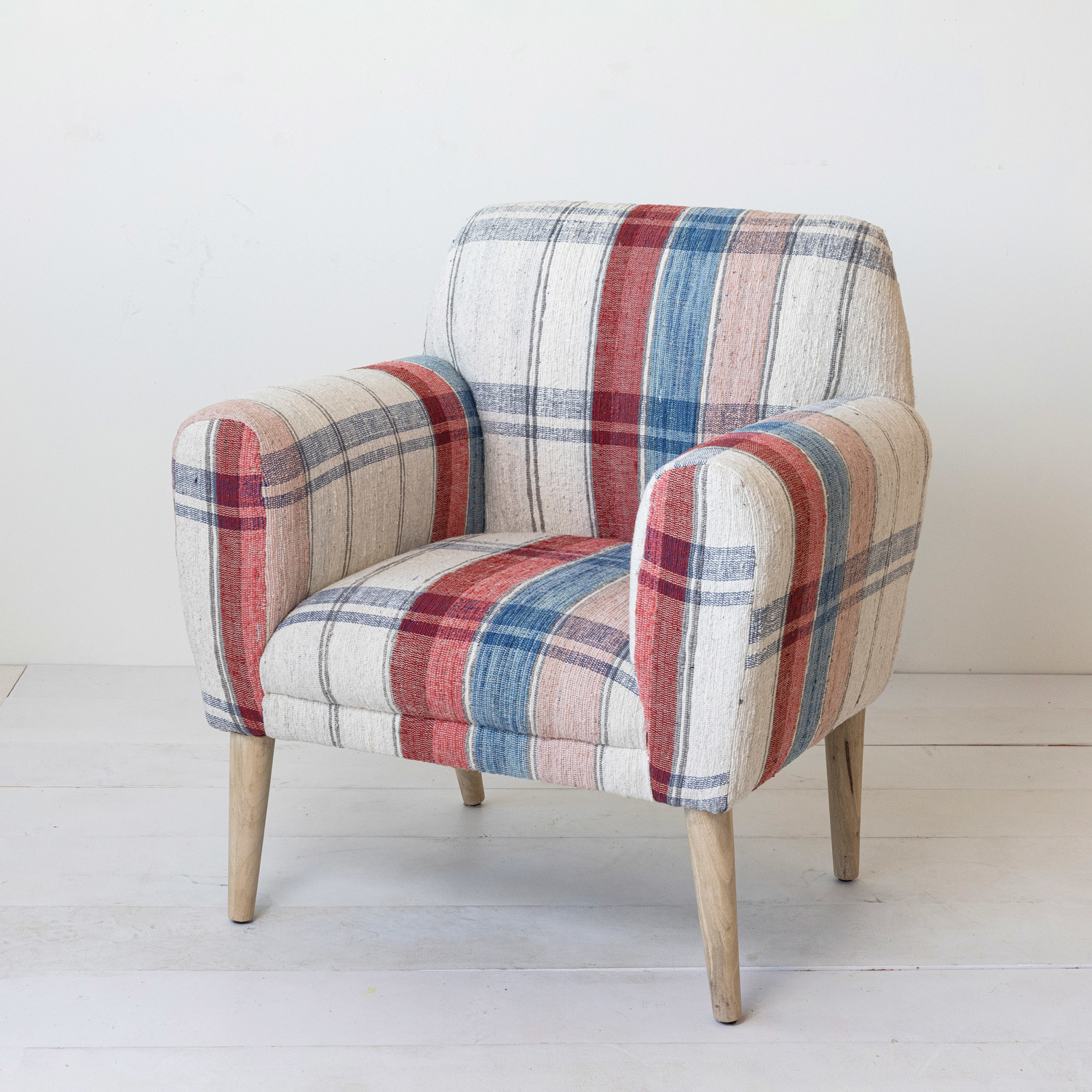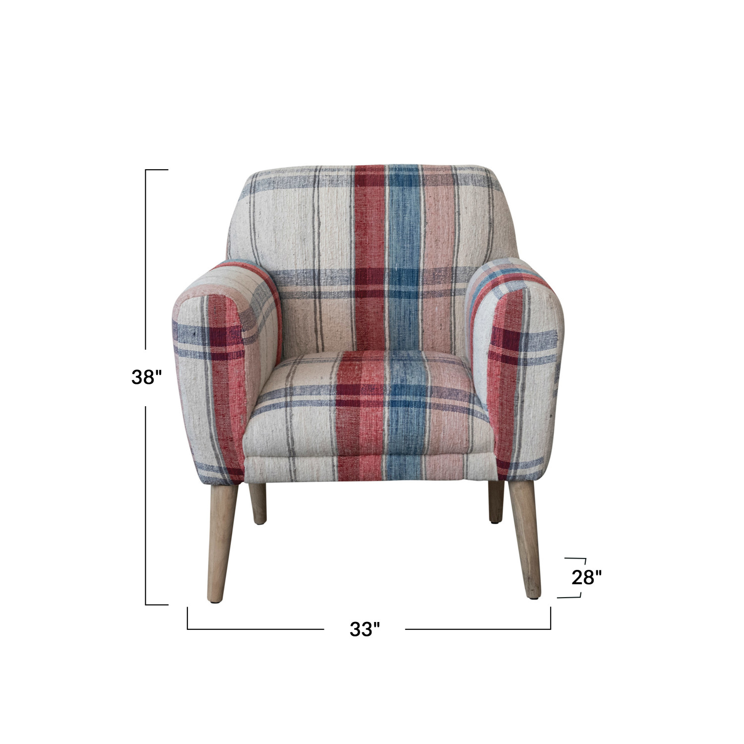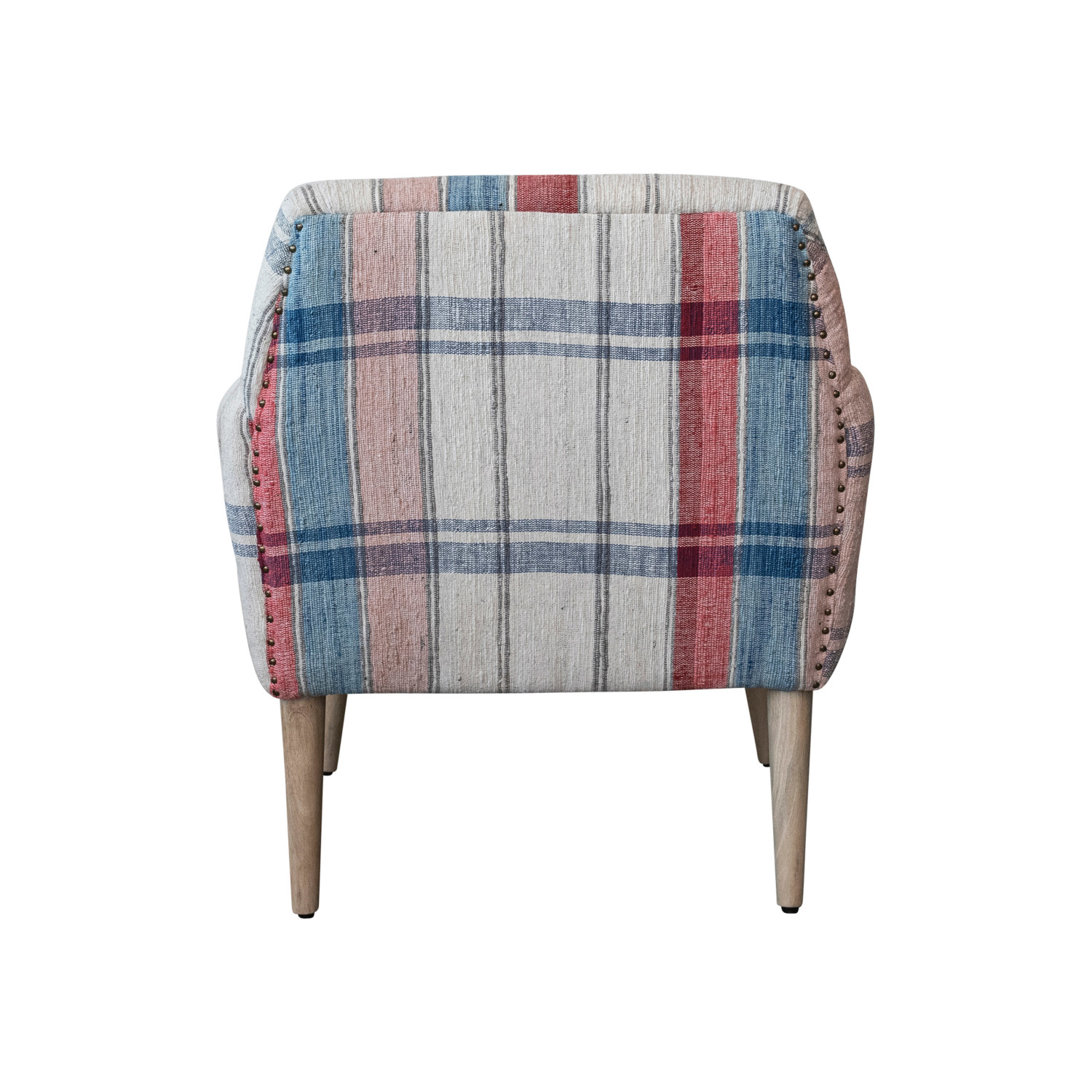 Catalog Name: 33"W x 28"D x 38"H Woven Cotton Upholstered Arm Chair w/ Mango Wood Legs & Nail Heads, Multi Color Plaid & Bleached, KD, Truck Ship