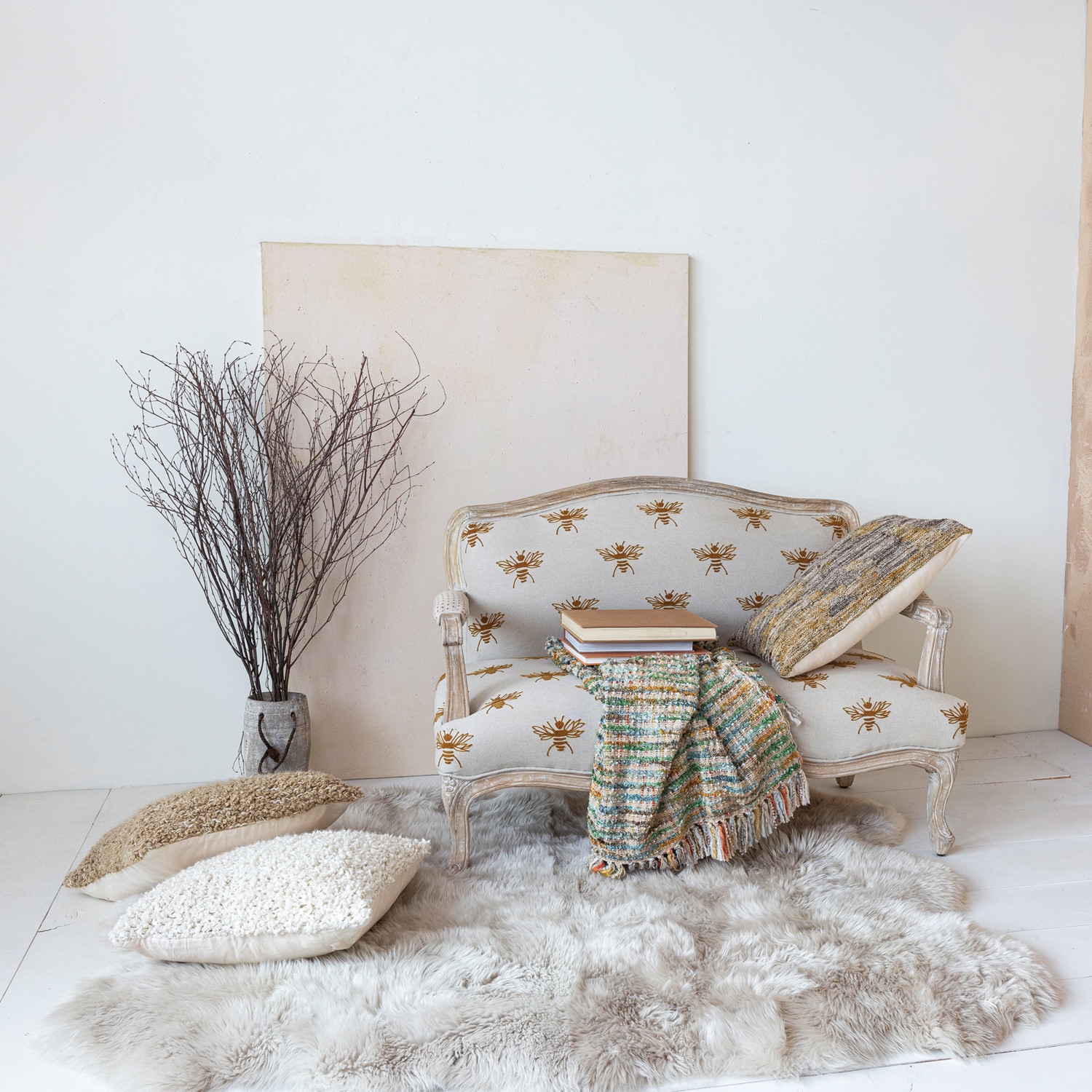 This charming and cozy sofa is made of cotton and linen, with a mango wood frame and embroidered bees pattern. The body is a natural and mustard color, adding warmth and contrast. The mango wood frame and legs add stability and elegance, with a whitewashed finish complementing the fabric. The embroidered bees pattern adds whimsy and flair, matching the body and creating a dynamic look. This sofa is suitable for any room style, from farmhouse to French country, boho to Scandinavian, lodge to square. It can be used as a sofa, daybed, or guest bed, and can be placed in various spaces. The sofa is eco-friendly, durable, and soft, and comes fully assembled. It measures 50 inches in length, 27 inches in width, and 35 inches in height. This versatile and cozy accessory will enhance the room style and ambiance.