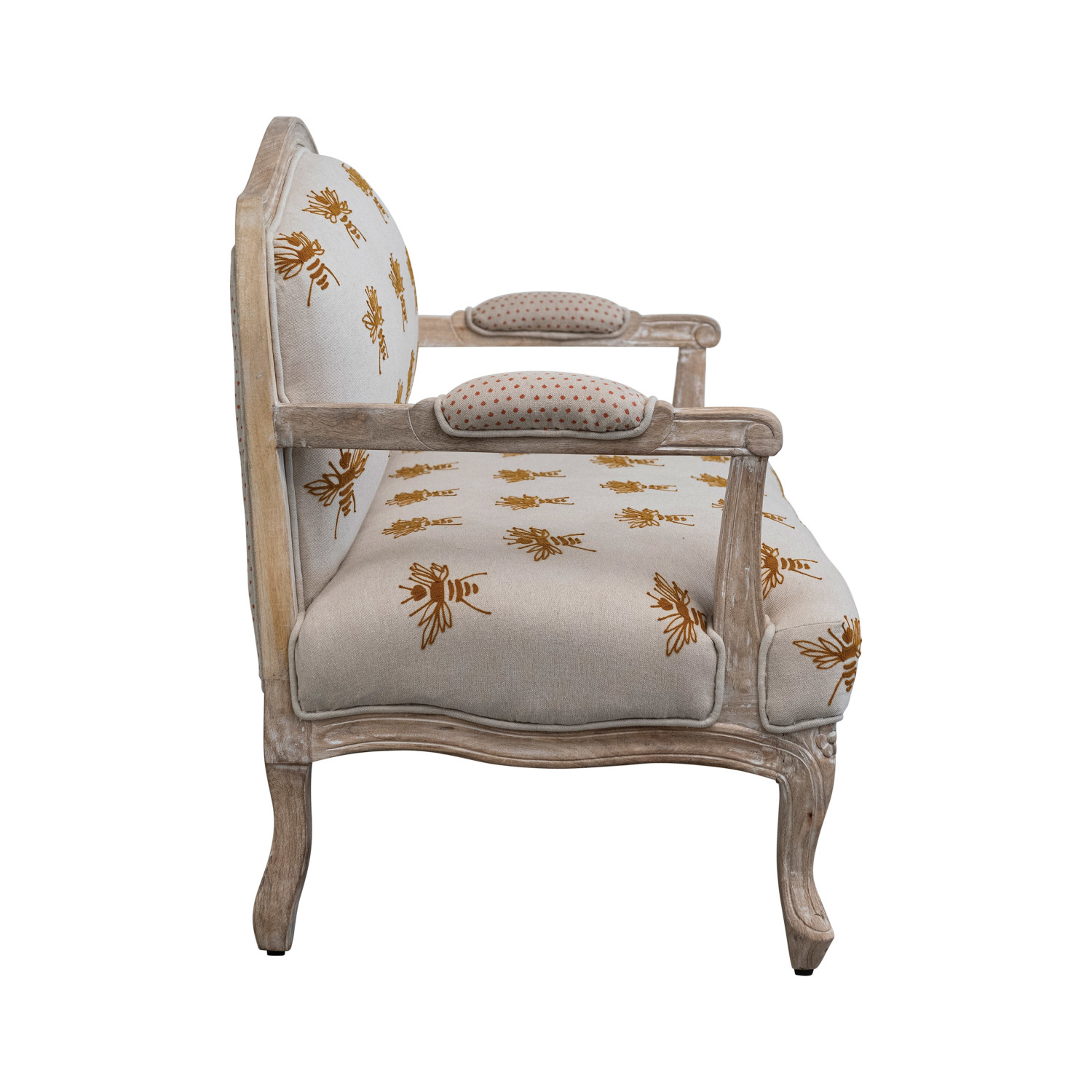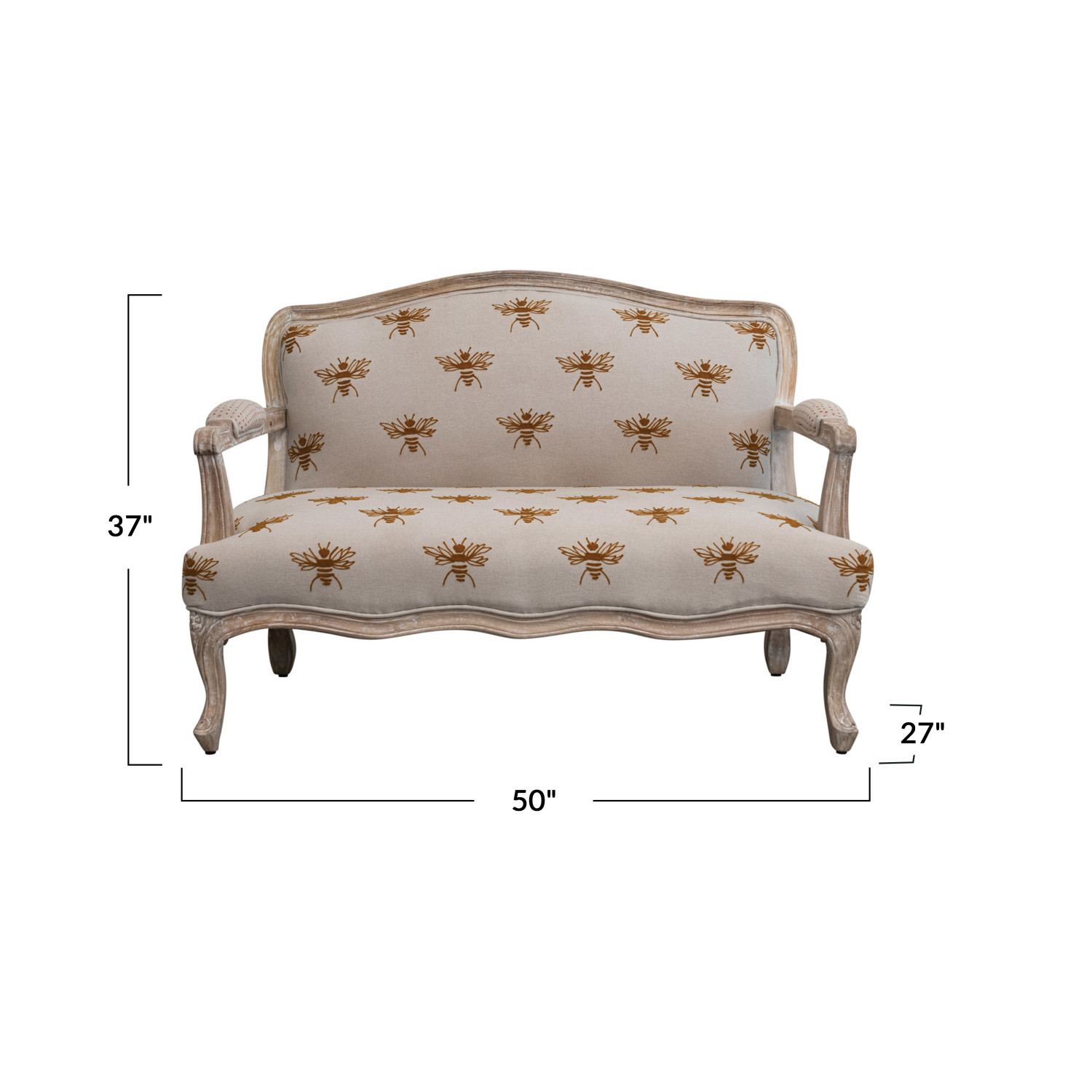 Catalog Name: 50"W x 27"D x 37"H Cotton & Linen Printed Upholstered Sofa w/ Mango Wood Frame & Embroidered Bees/Dots Pattern, Whitewashed, Natural & Mustard Color, Truck Ship