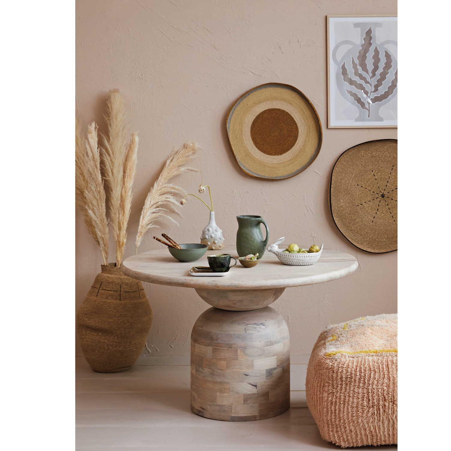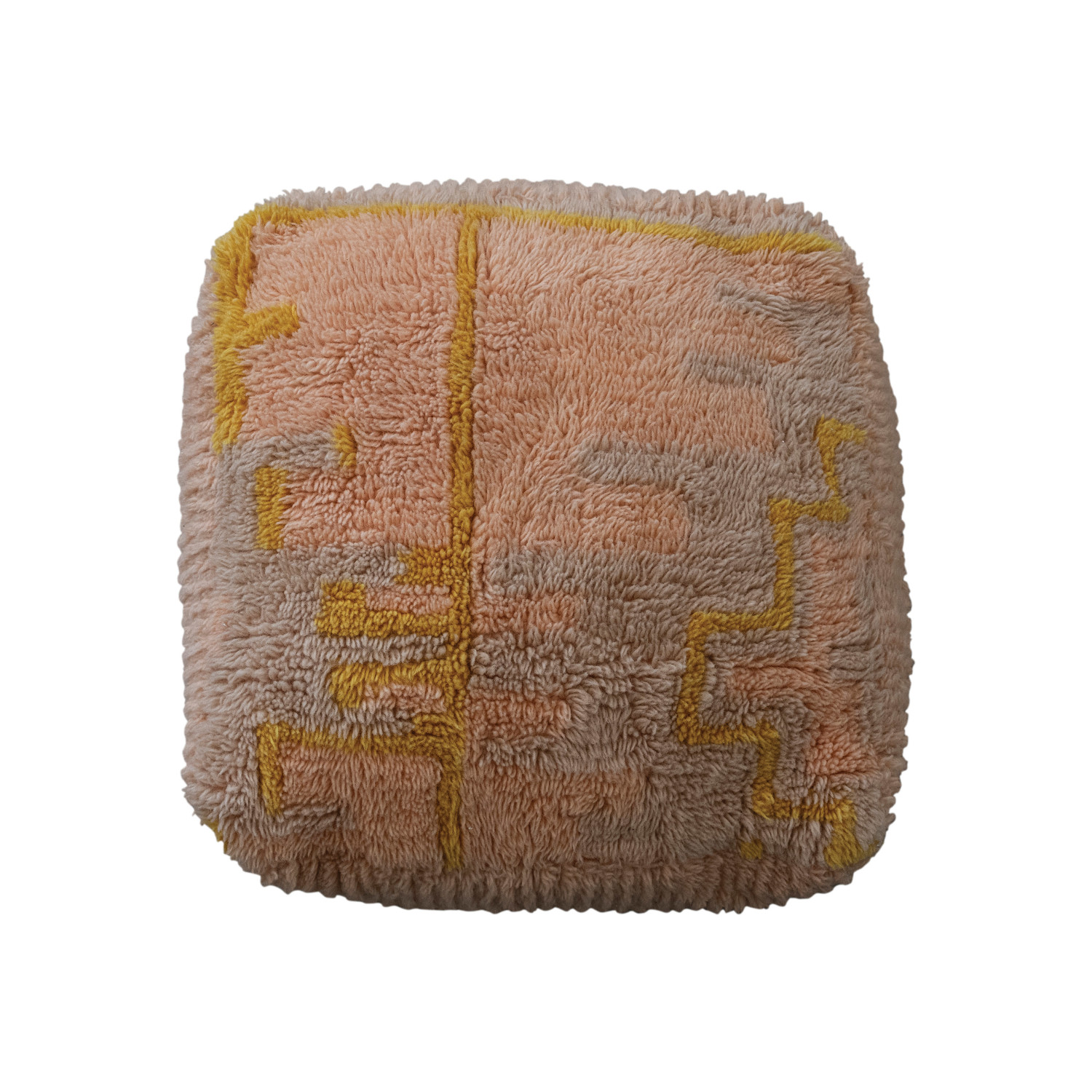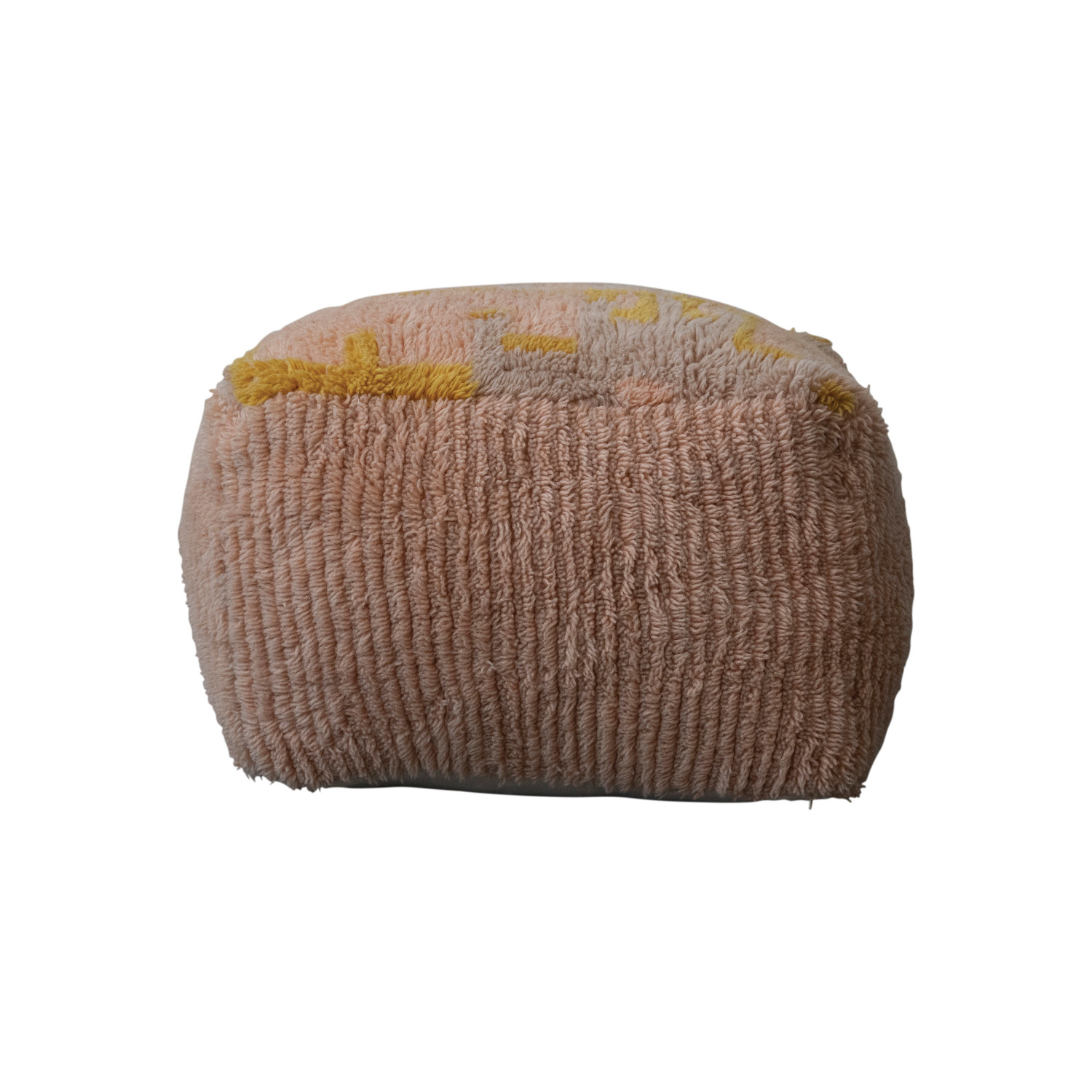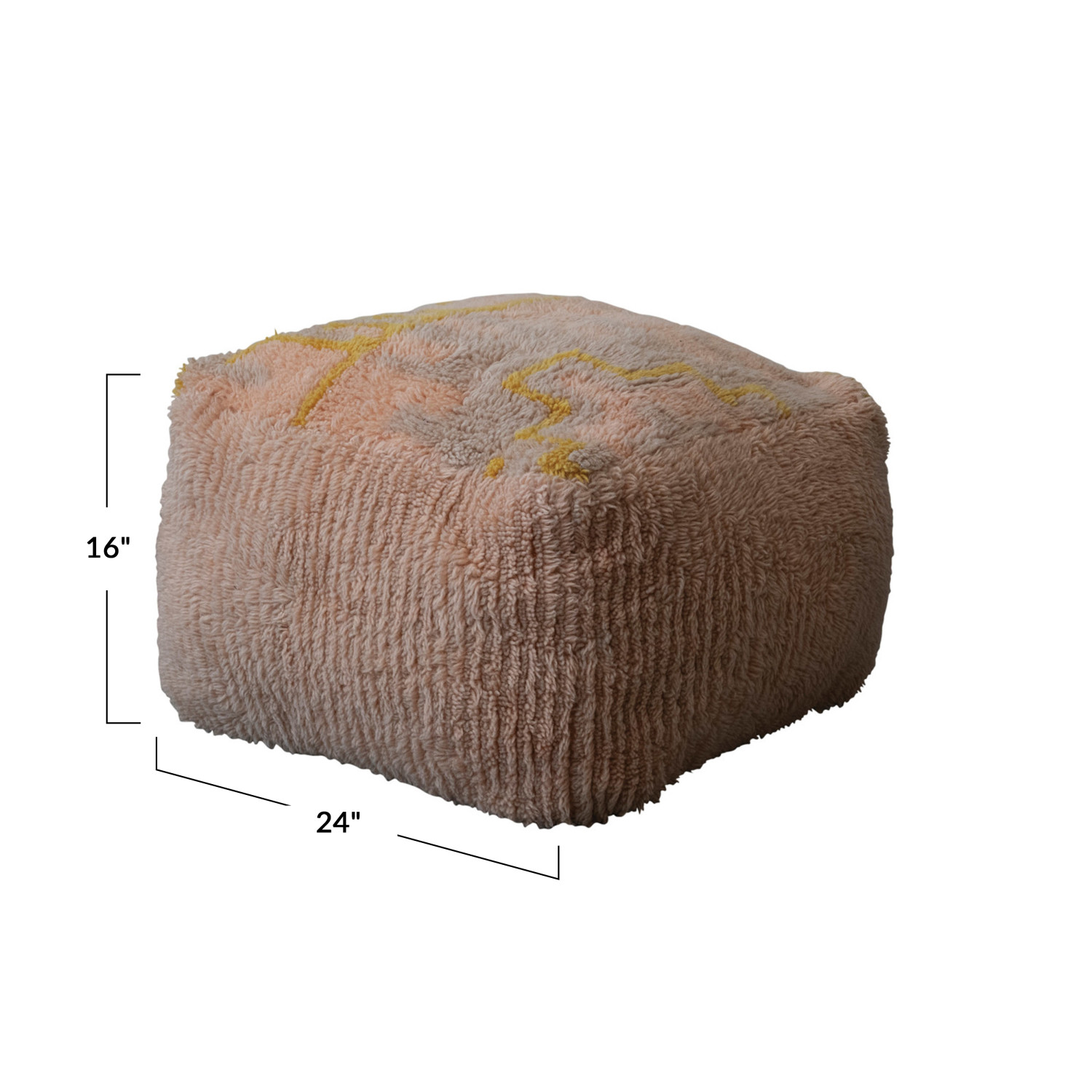 This woven New Zealand wool shag pouf is a versatile and cozy accessory that enhances the space. It features a woven New Zealand wool shag body with a pink, yellow, and cream color, providing a soft texture and cozy support. The pouf also has a cotton base and piping, adding stability and contrast. The geometric design, matching the body, adds style and flair. This pouf is suitable for any room style, from farmhouse to French country, modern to Scandinavian, and coastal to square. It can be used as a pouf, ottoman, or floor cushion, and can be placed in various rooms. The pouf is made of eco-friendly, durable, and soft New Zealand wool shag and cotton, and measures 24 inches in length, 24 inches in width, and 16 inches in height. It is a versatile and cozy accessory that will enhance the room style and ambiance.