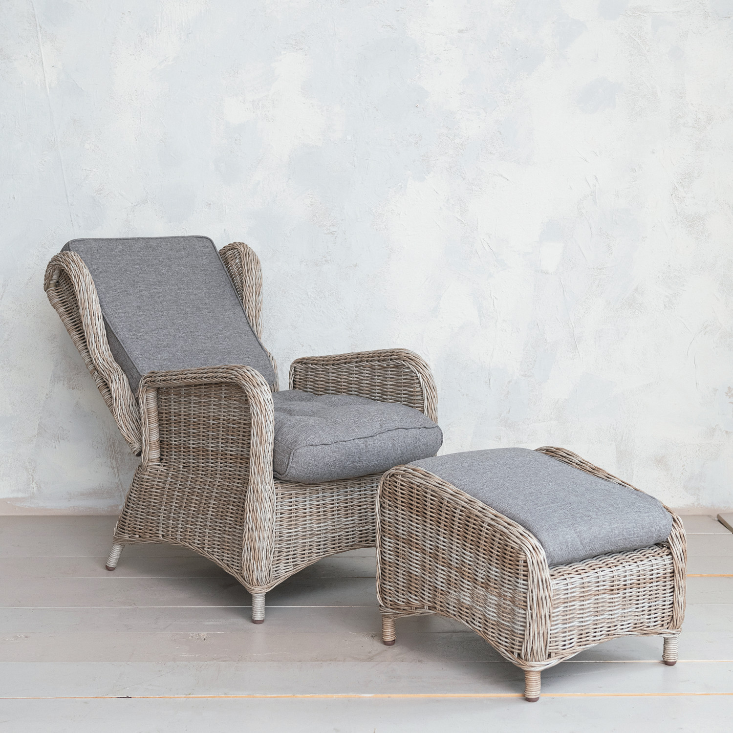 Catalog Name: 24"W x 34-3/4"D x 44"H Hand-Woven Plastic Wicker Reclining Indoor/Outdoor Chair w/ 19-1/2"W x 24"D x 18"H Ottoman & Fabric Cushions, Natural & Grey, Set of 2, Truck Ship