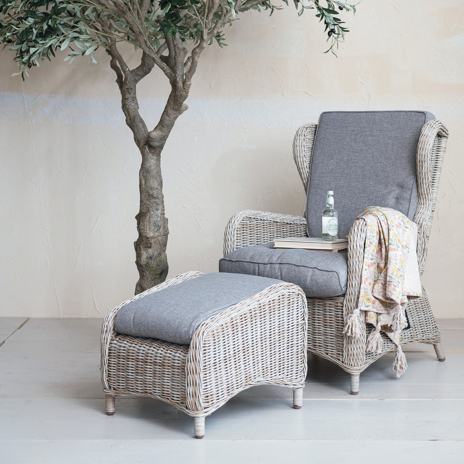 This Wicker Haven Chair and Ottoman Set invites anyone to indulge in the art of relaxation. The chair, standing 40.5 inches tall, is crafted with a sturdy aluminum frame and wrapped in the finest wicker, offering both resilience and aesthetic appeal. The accompanying ottoman, upholstered in soft polyester, provides a comfortable extension for the legs, completing the set's invitation to unwind. With its square design and natural grey hues, the set is a perfect match for homes that celebrate the eclectic spirit of boho, the warmth of farmhouse style, or the unique flair of eclectic decor. It's not just furniture; it's a lifestyle choice that promises comfort and style in equal measure.