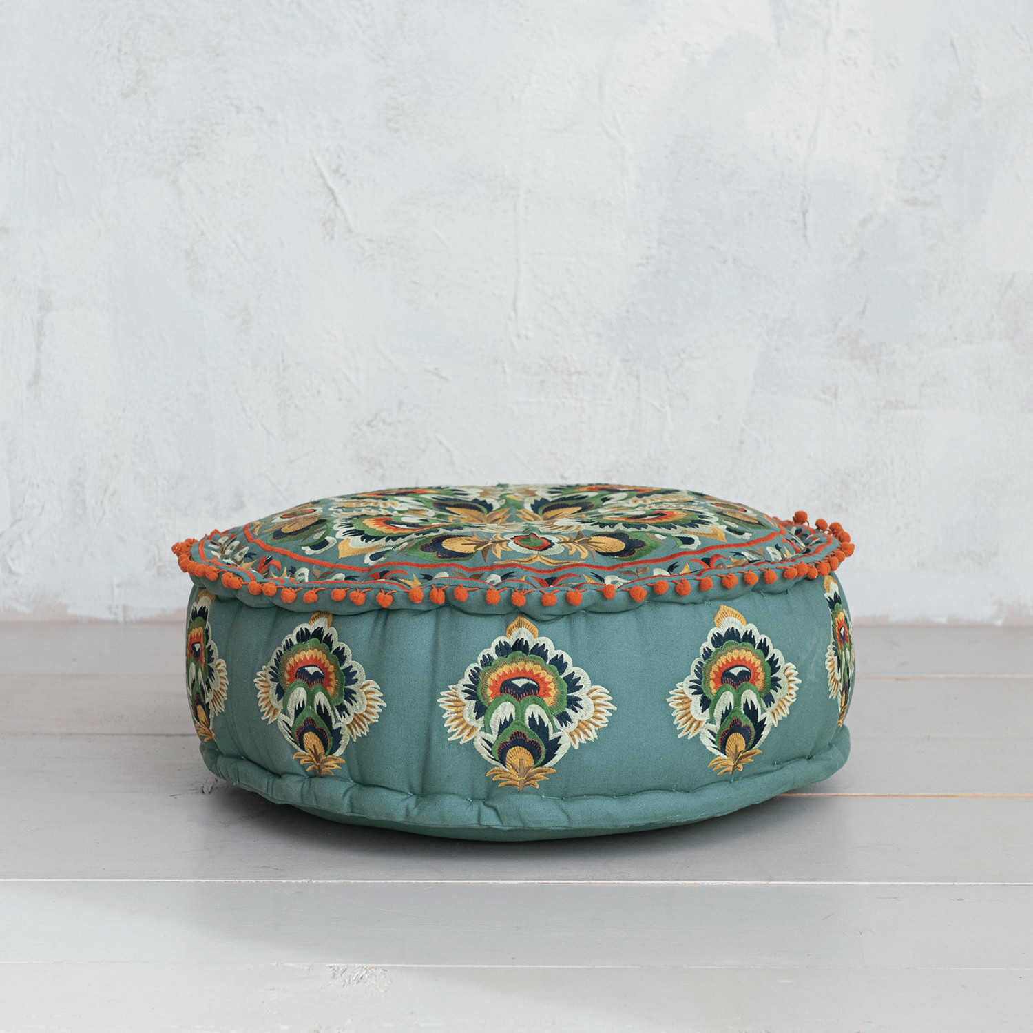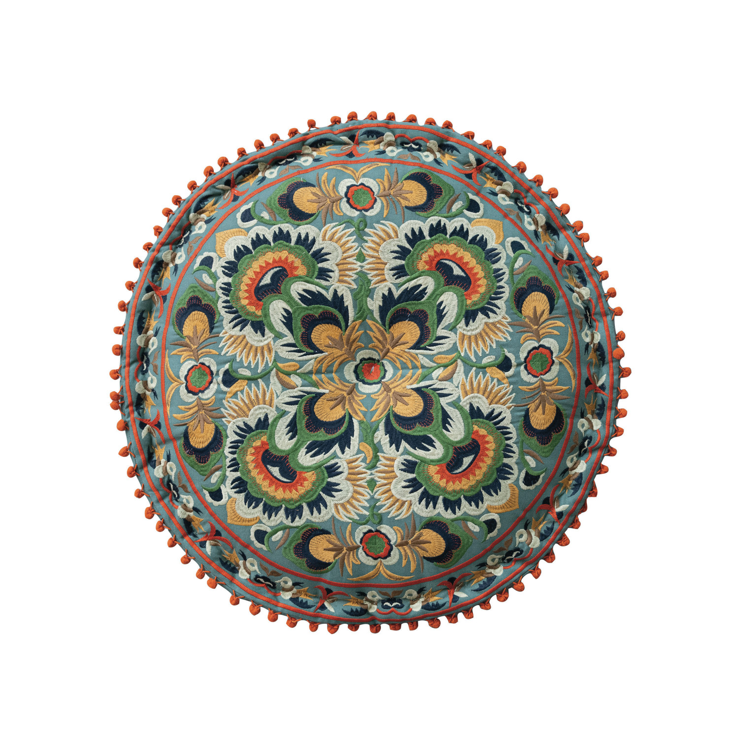 Catalog Name: 24" Round x 8"H Cotton Embroidered Pouf w/ Pom Poms, Multi Color