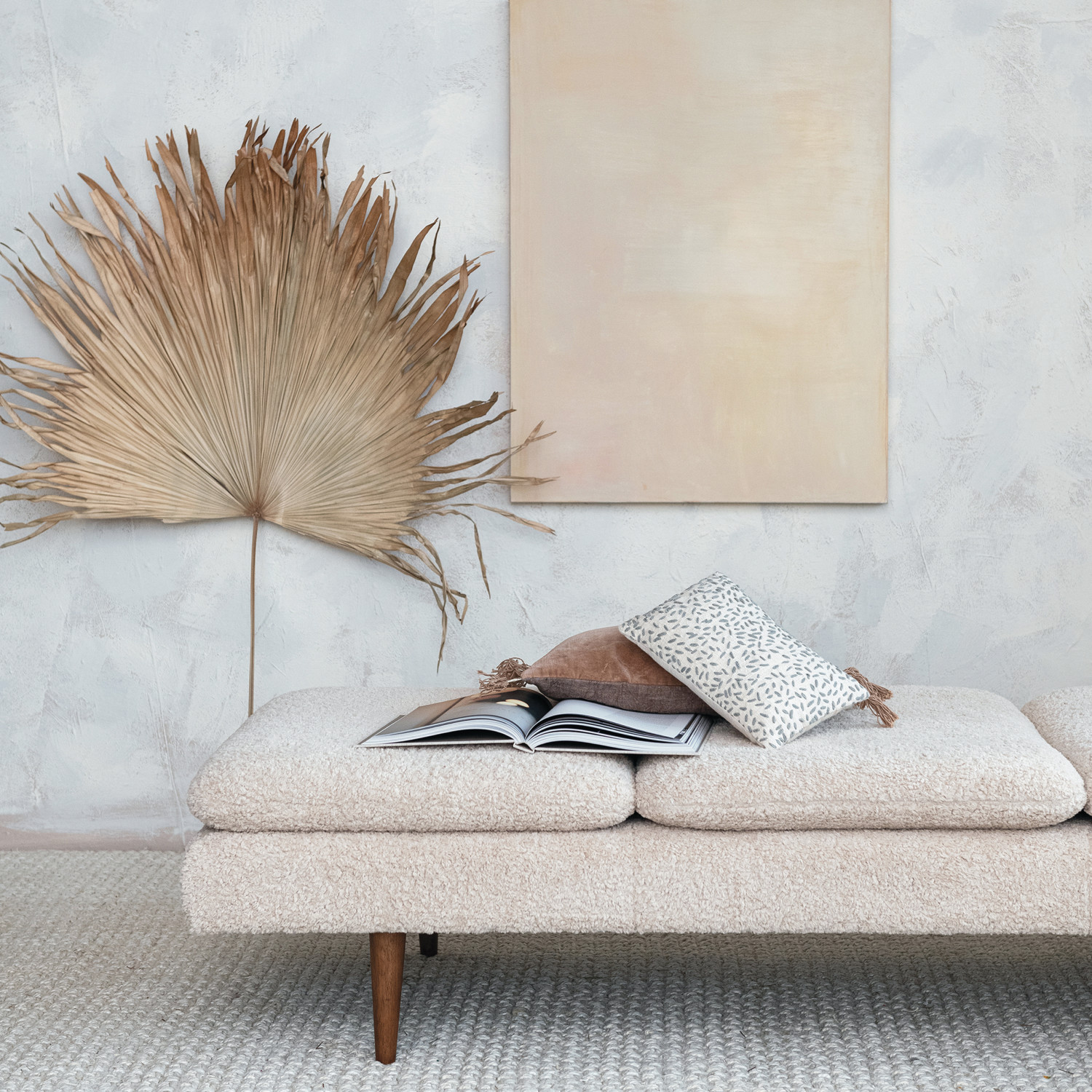 Catalog Name: 77-1/2"W x 30-1/4"D x 18-1/2"H Bouclé Fabric Upholstered Daybed w/ Rubberwood Legs, Oak Finish, Cream Color, KD, Truck Ship