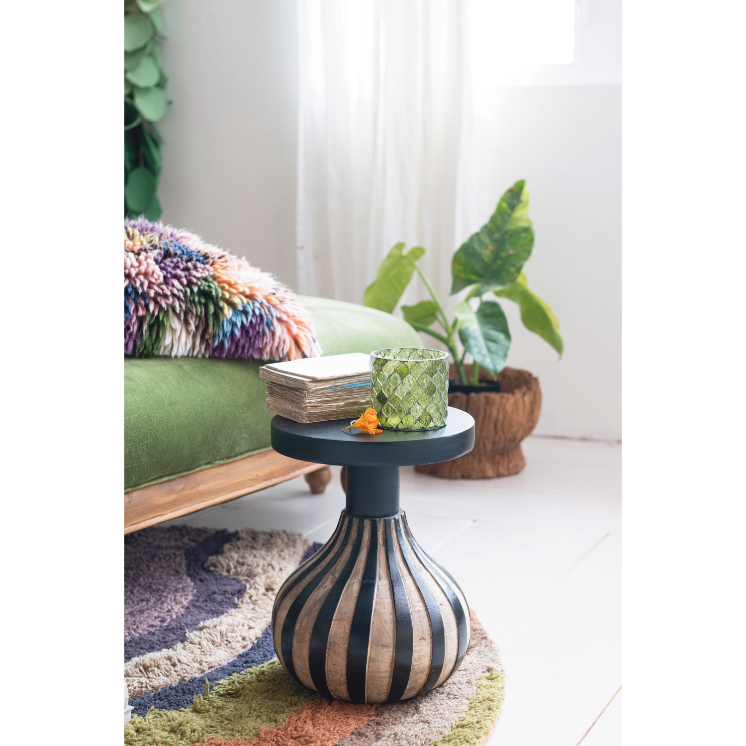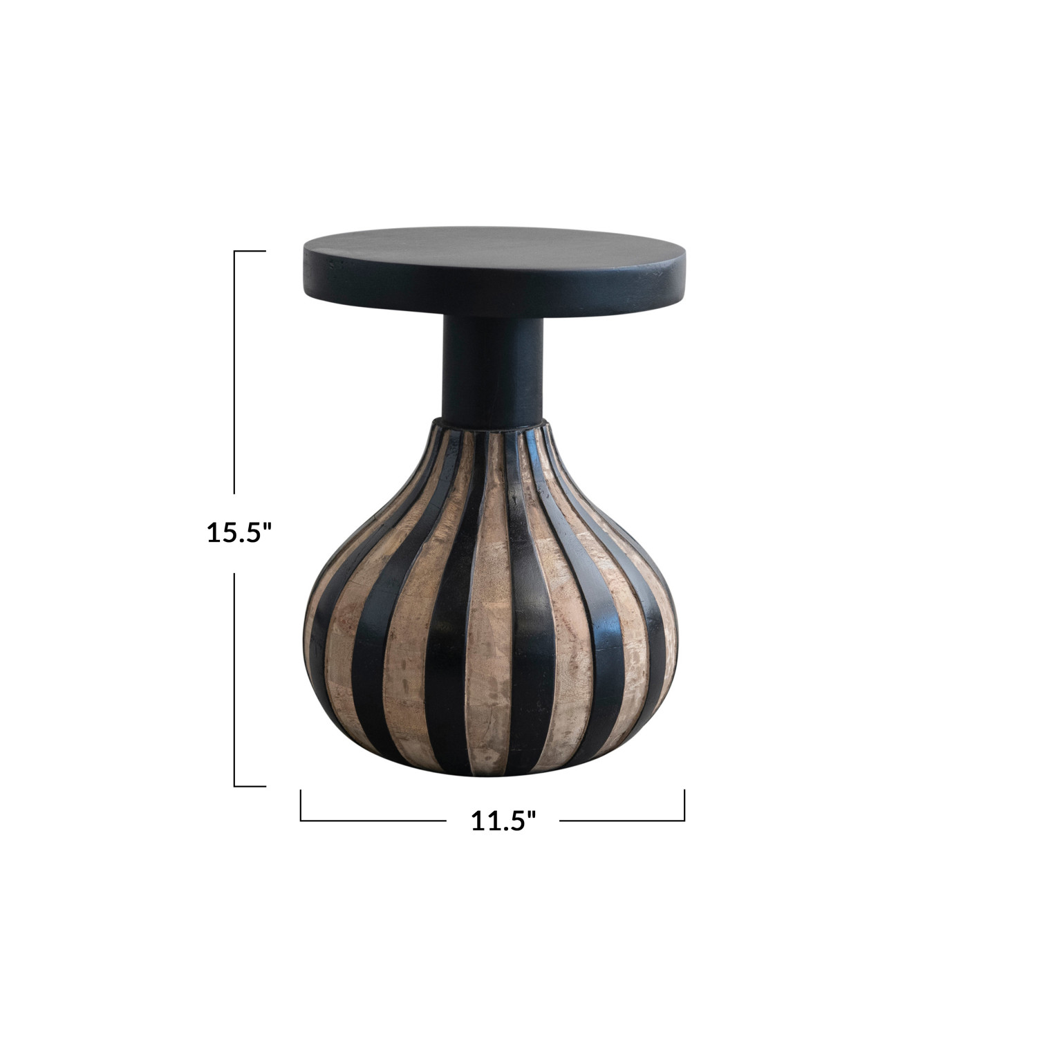 Catalog Name: 11-1/2" Round x 15-1/2"H Mango Wood Table w/ Carved Striped Base, Black & Natural, Truck Ship