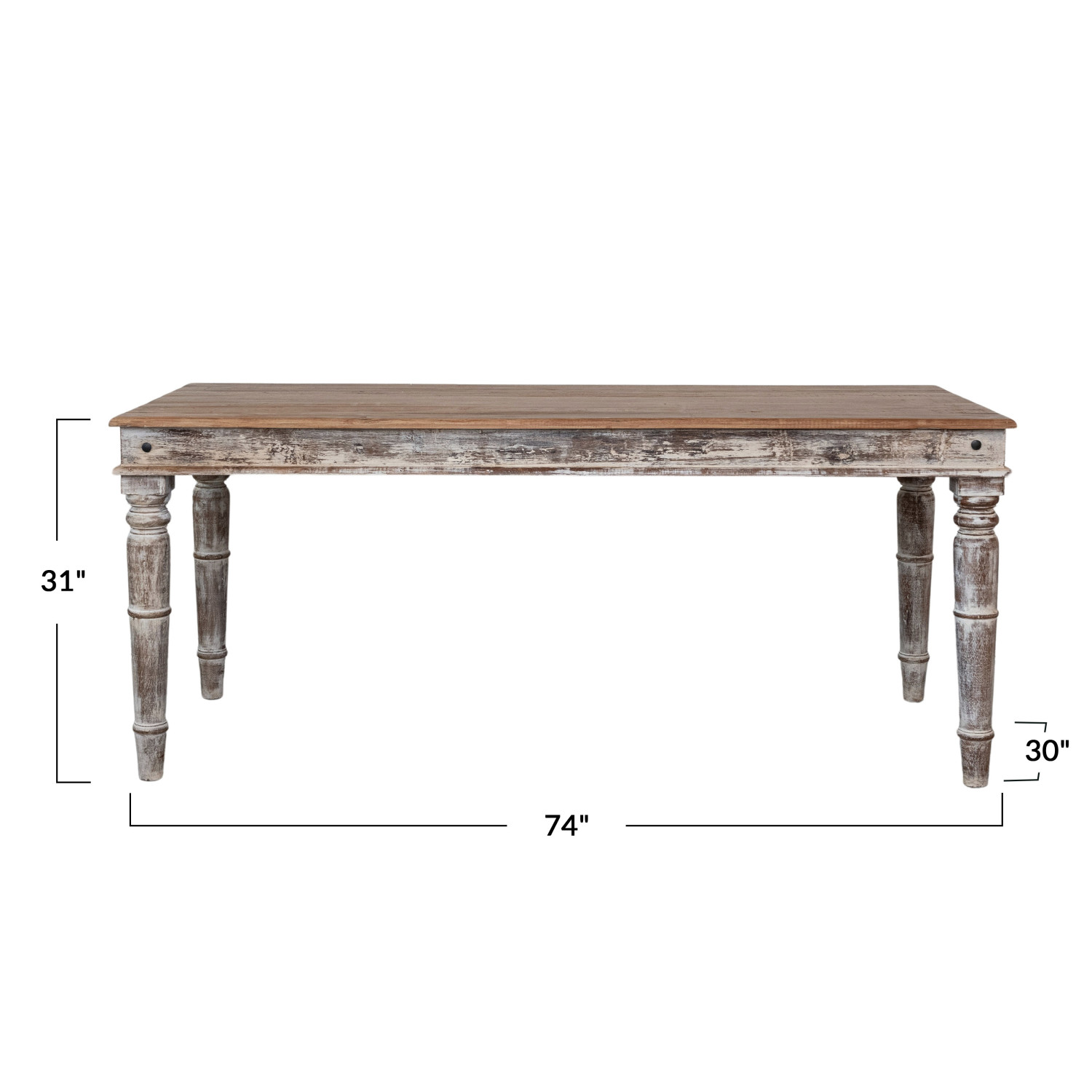 Catalog Name: 74"L x 30"W x 31"H Reclaimed Wood Vintage Reproduction Farmhouse Dining Table, Natural & Distressed Whitewashed, KD, Truck Ship