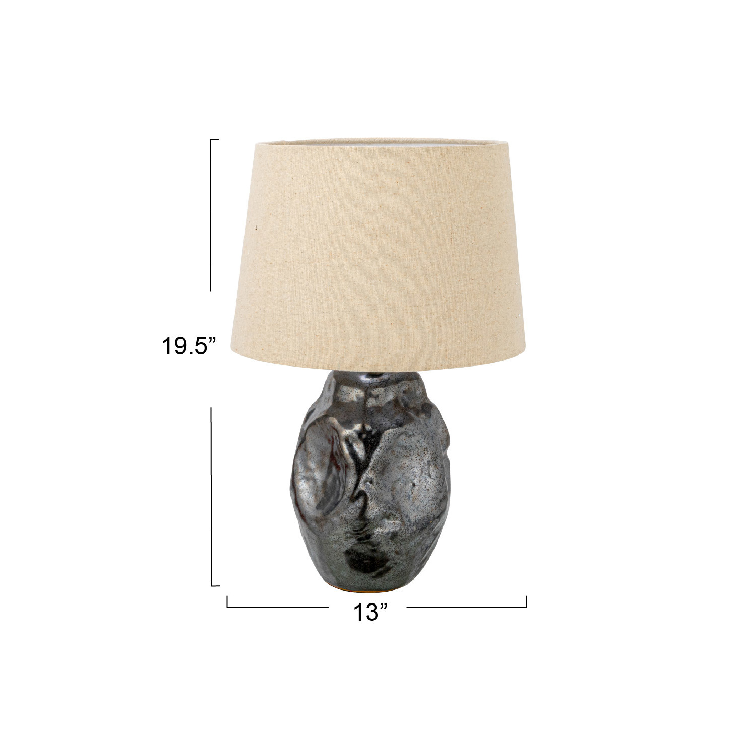 Catalog Name: 13" Round x 20"H Ceramic Organic Shaped Table Lamp w/ Fabric Shade & Inline Switch, Metallic Reactive Glaze, Gunmetal Color (Each One Will Vary)