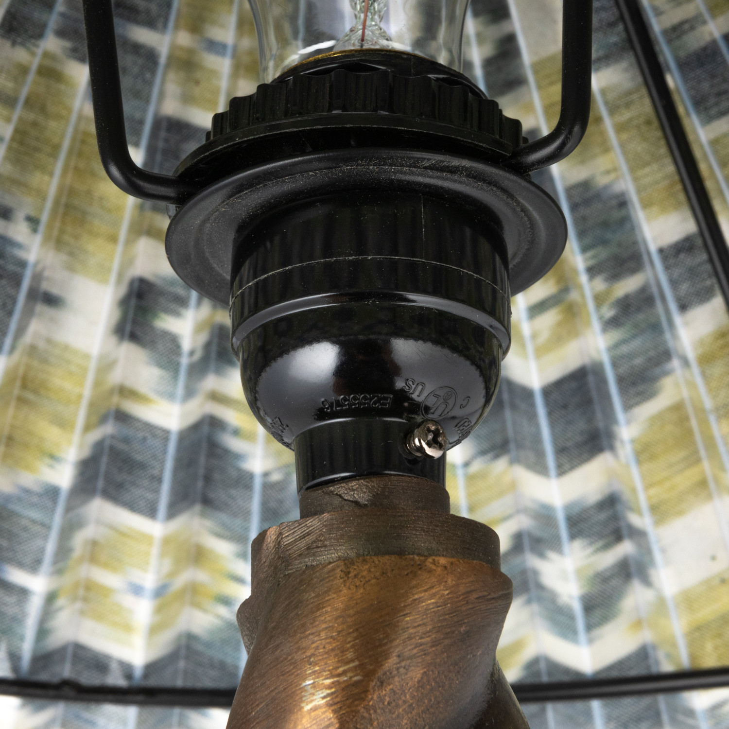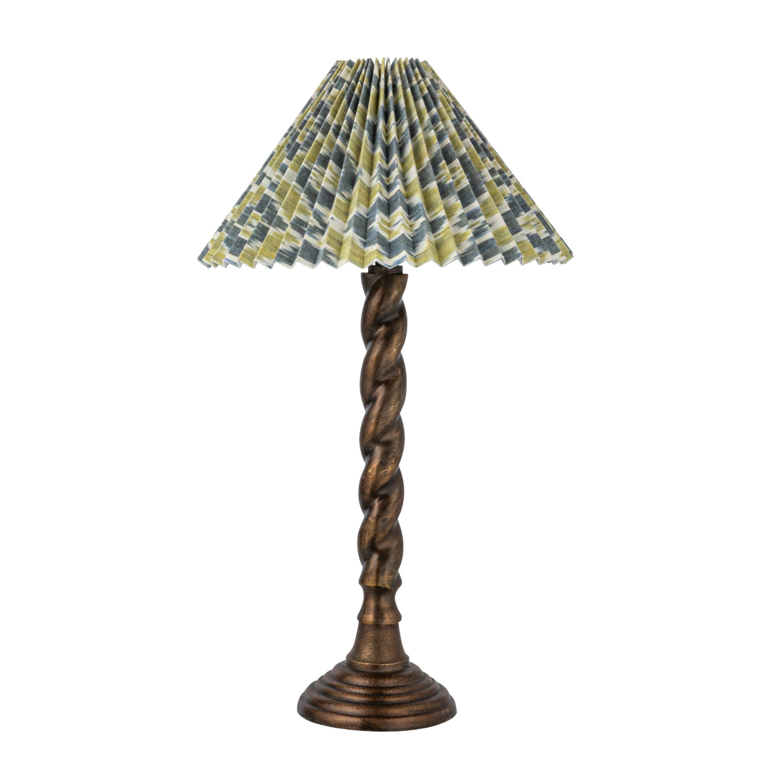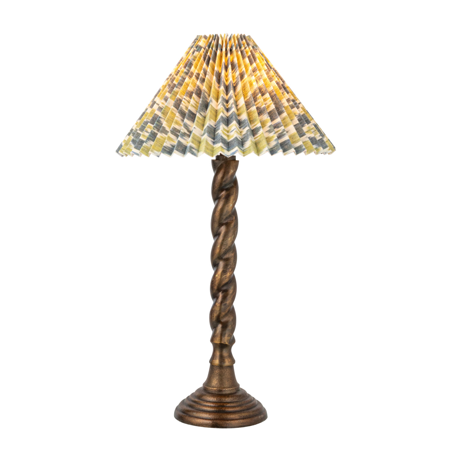 Catalog Name: 13-1/2" Round x 24"H Metal Candlestick Table Lamp w/ Pleated Cotton Ikat Shade & Inline Switch, Antique Brass Finish & Multi Color
